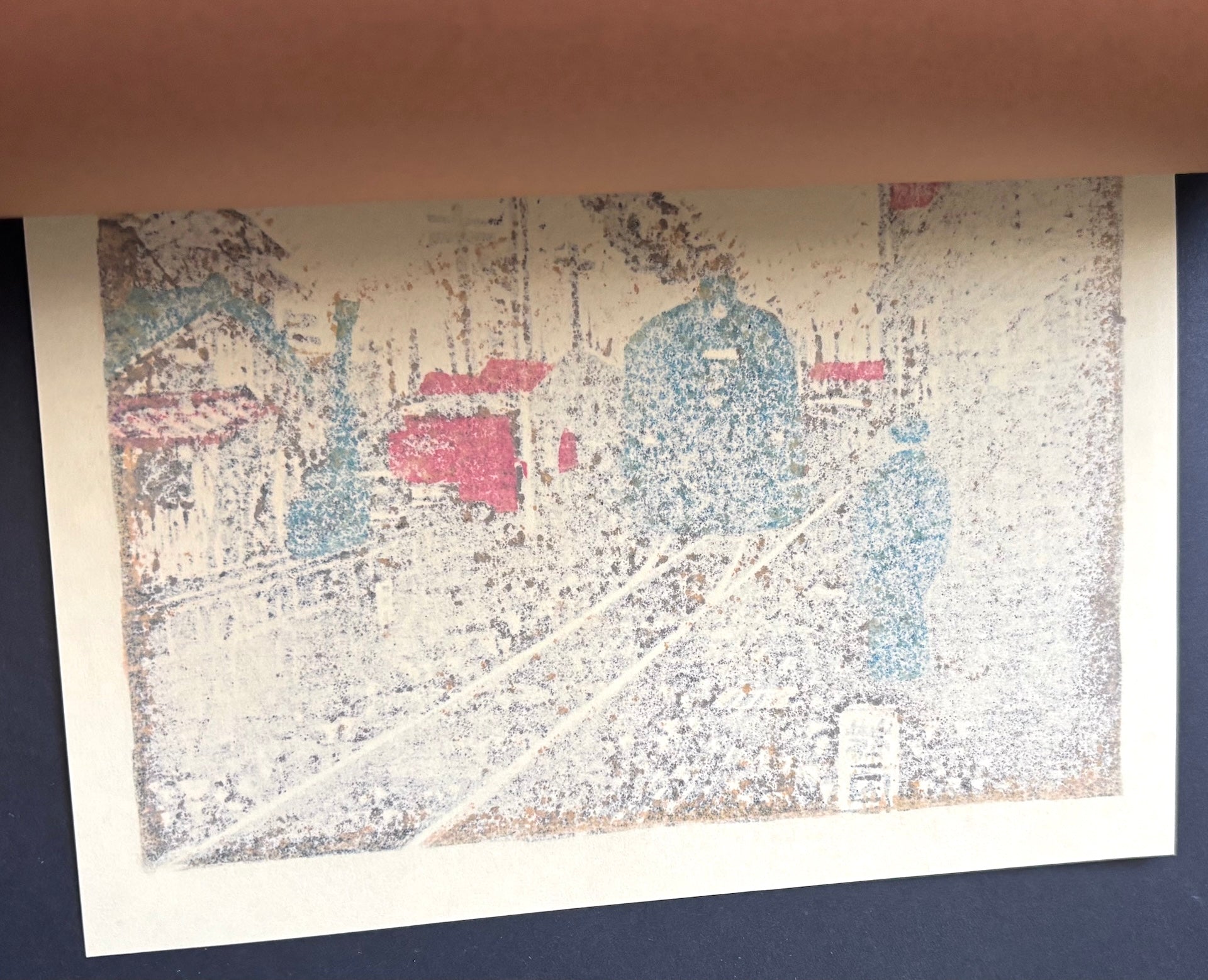 The beautiful small woodblock print “Locomotive at Kabe Station, Hiroshima” is by Osamu Ueda (b. 1947). This work depicts locomotives being switched at Kabe Station in Hiroshima Prefecture. These locomotives, which are no longer seen today, evoke a nostalgic Showa-era atmosphere.
