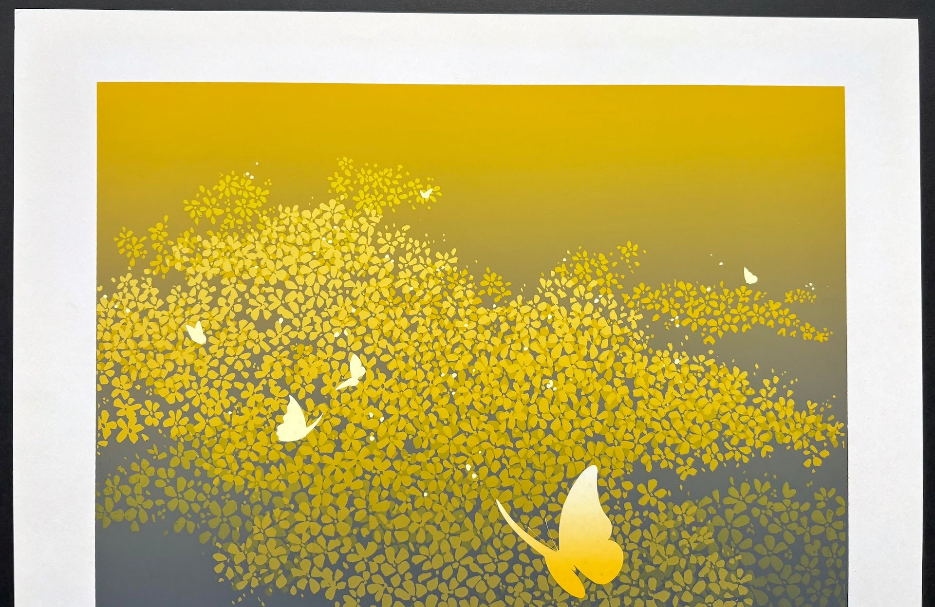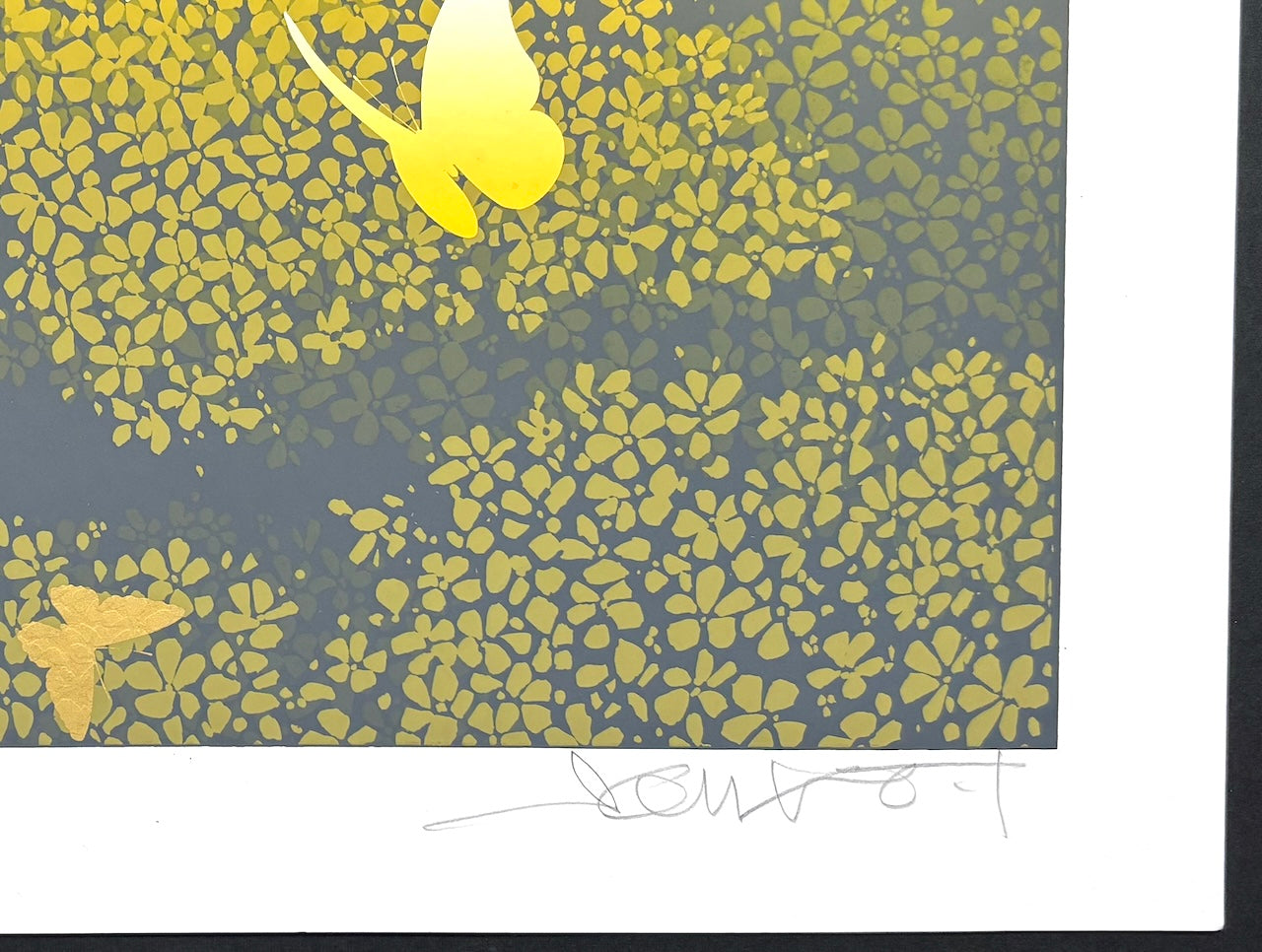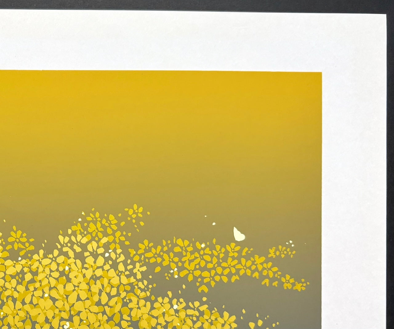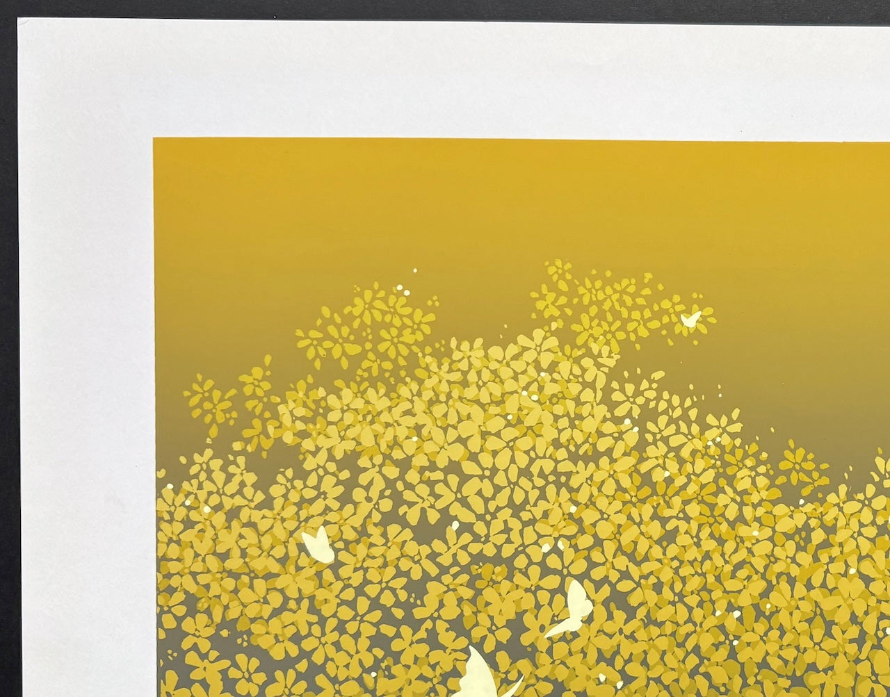 The breathtaking silkscreen print 'Mai-4' (Dance -4) is by Soho Ikegami (b.1940). This print captures a gentle ballet of butterflies drifting above a field of delicate flowers. Their weightless movement creates a scene of quiet harmony, evoking a feeling of calm and tenderness. Subtle, nuanced shading deepens the atmosphere, allowing the artwork’s serene beauty to softly unfold.