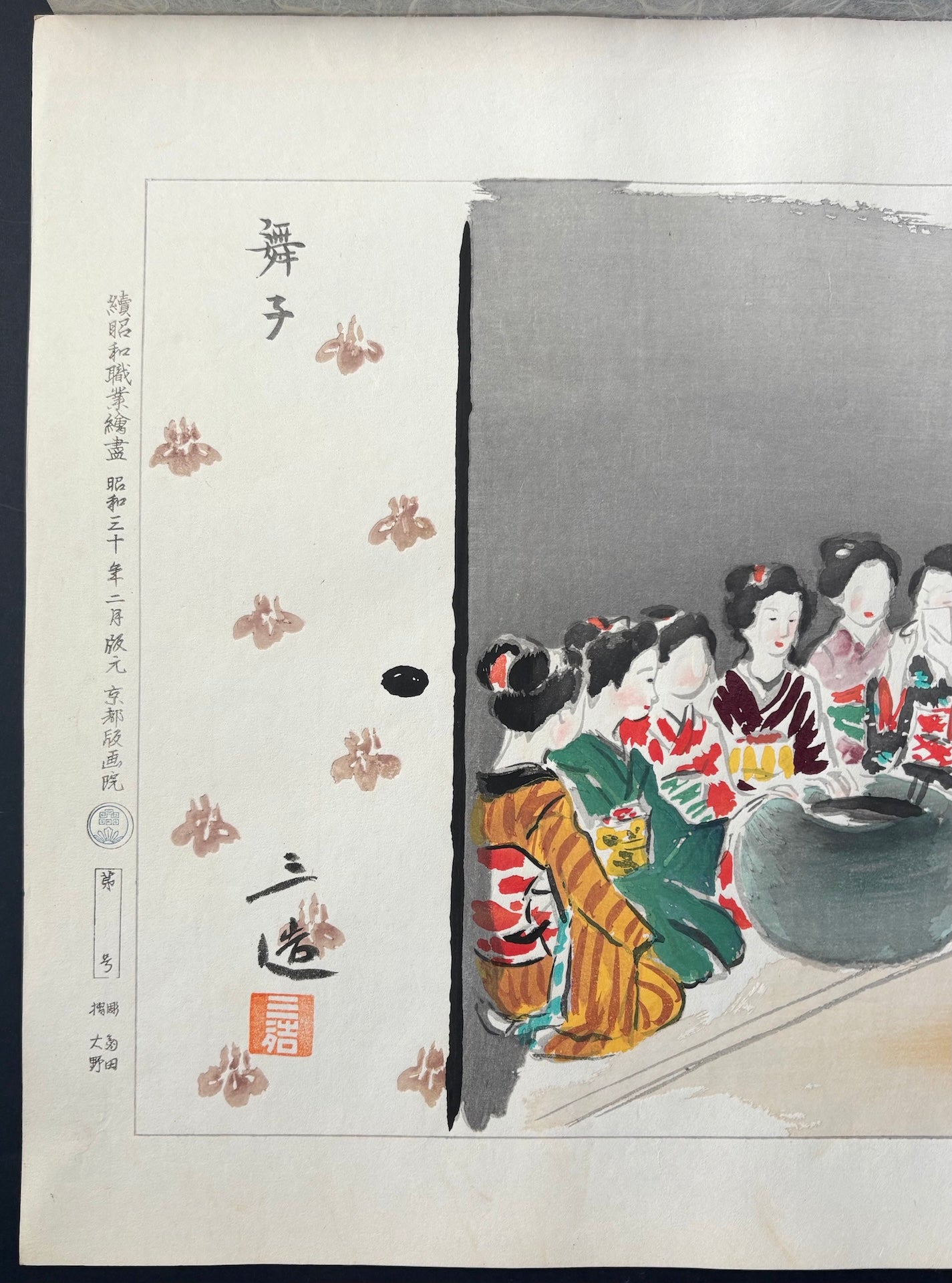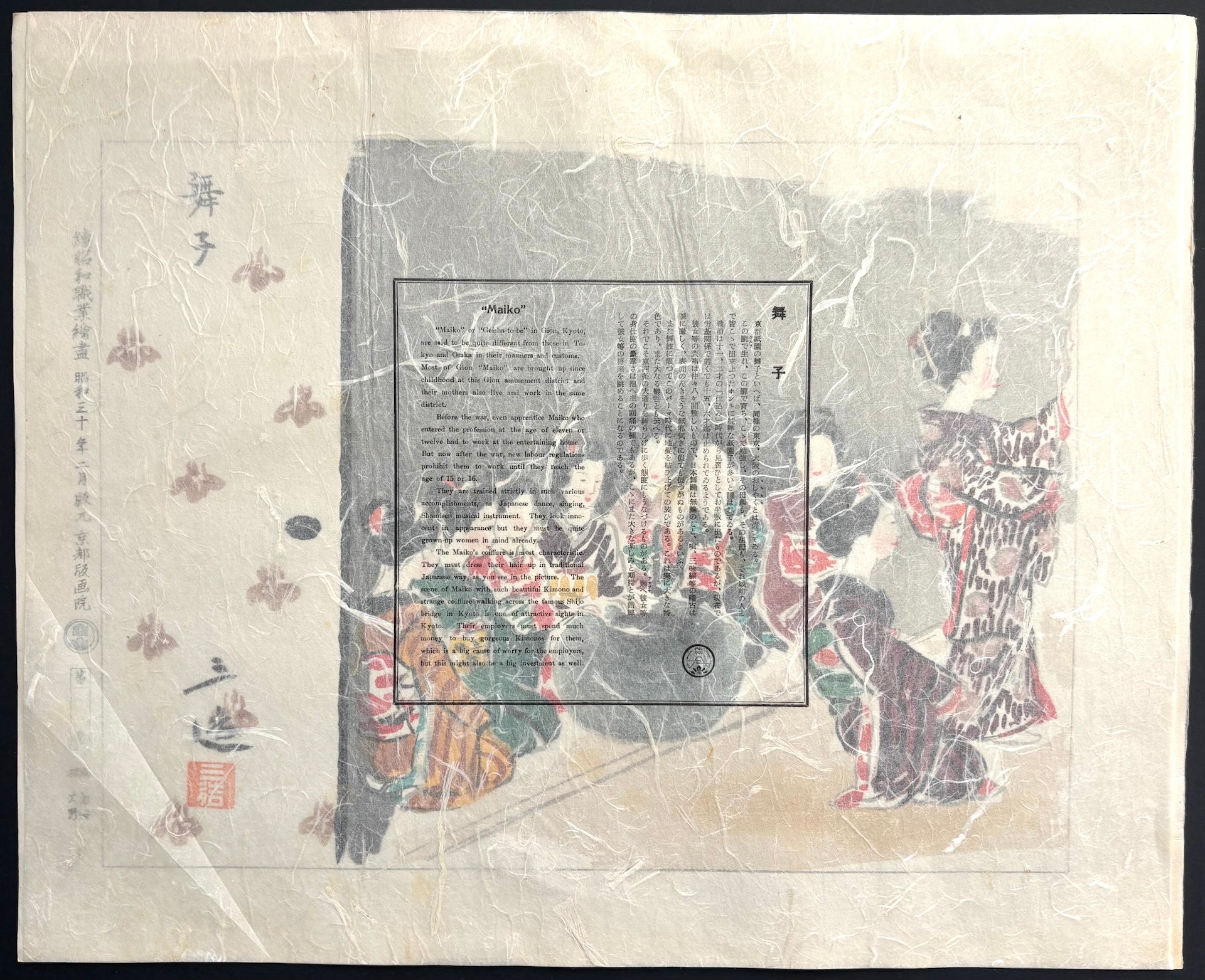 The series title “Showa Shokugyō E-zukushi” appears in the left margin, accompanied by the date “Showa 30 nen 2 gatsu” (February 1955), the publisher “Kyoto Hanga-in,” the carver “Kikuta,” and the printer “Ohno.” The subtitle “Maiko” is positioned in the upper left corner of the image, while the artist’s hand signature and red seal are placed in the lower left. The print is accompanied by a delicate washi paper cover bearing a description of the work in both English and Japanese.