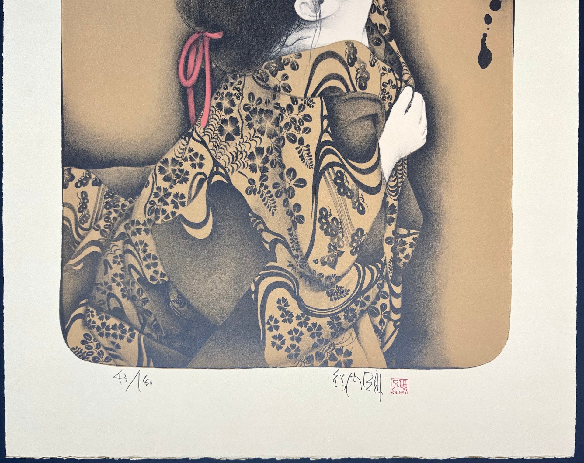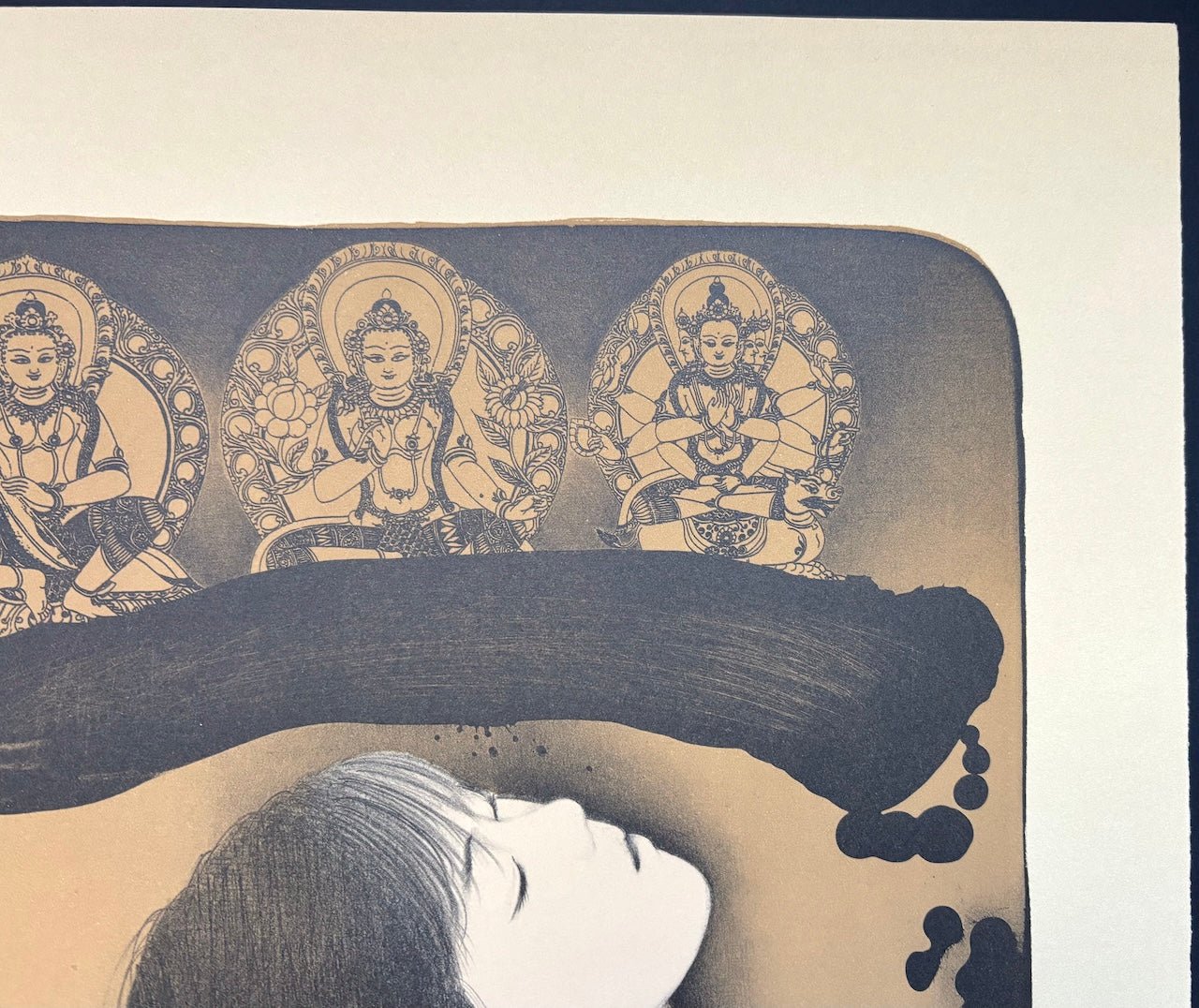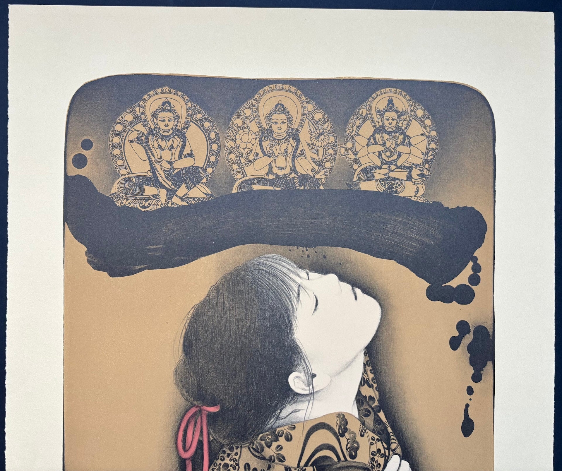 A beautiful lithograph, Mi (Self), is by Kyosuke Chinai (b. 1948). The composition portrays a young girl in a kimono beneath three serene Buddha statues. Her closed eyes convey a quiet, introspective expression. A single red ribbon in her hair stands out, providing a striking accent against the predominantly black and brown tones of the print. At the top, a bold brushstroke anchors the composition, lending it strength and quiet authority. The work is printed on deep ivory-colored paper, enhancing its warmth and timeless presence.