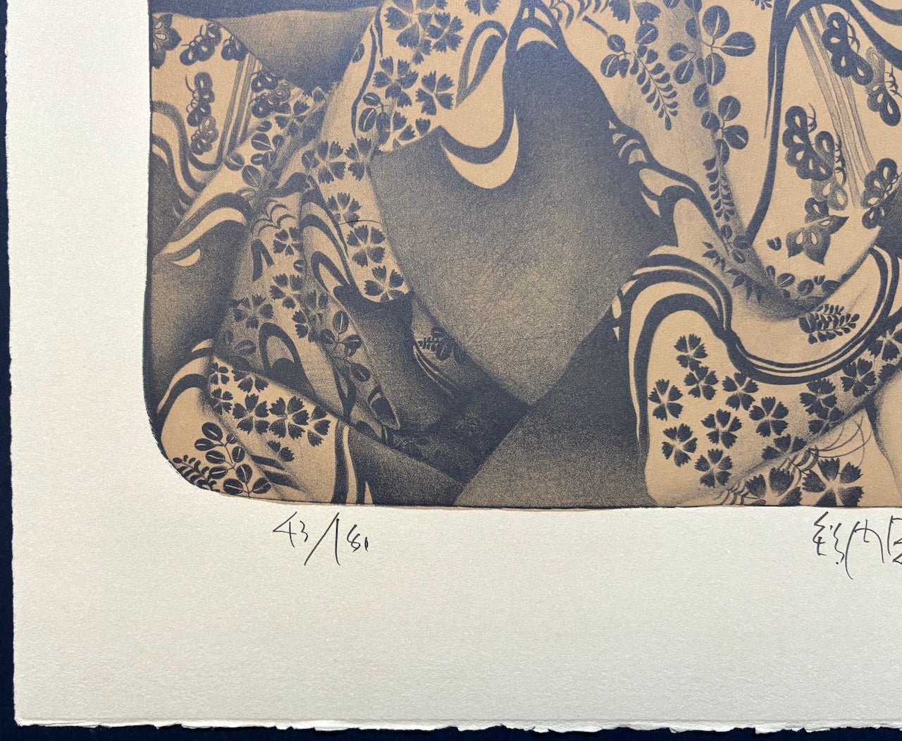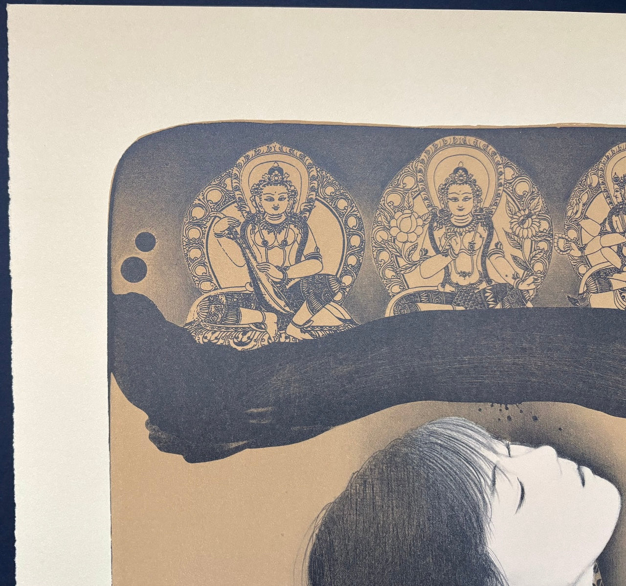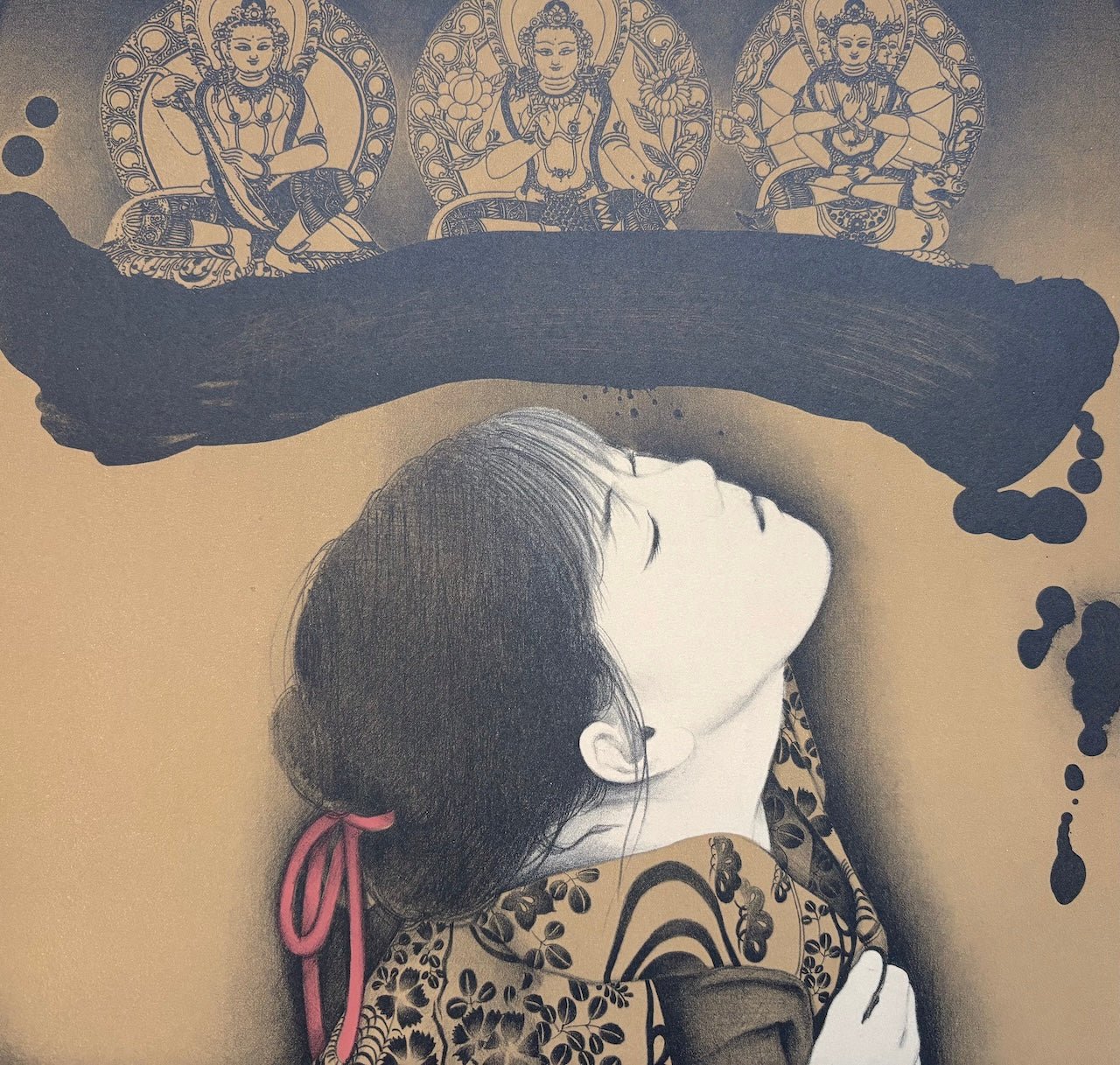 A beautiful lithograph, Mi (Self), is by Kyosuke Chinai (b. 1948). The composition portrays a young girl in a kimono beneath three serene Buddha statues. Her closed eyes convey a quiet, introspective expression. A single red ribbon in her hair stands out, providing a striking accent against the predominantly black and brown tones of the print. At the top, a bold brushstroke anchors the composition, lending it strength and quiet authority. The work is printed on deep ivory-colored paper, enhancing its warmth and timeless presence.