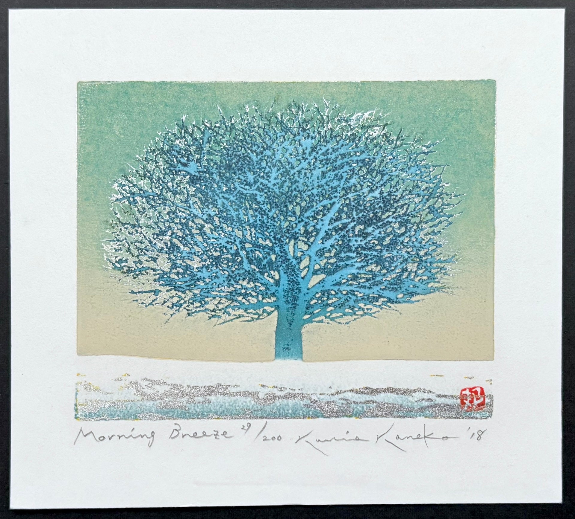 The elegant woodblock print “Morning Breeze” by Kunio Kaneko presents a solitary tree in quiet, dignified stillness. Created in 2018, it is signed, titled, dated, and numbered by the artist in pencil along the lower margin.