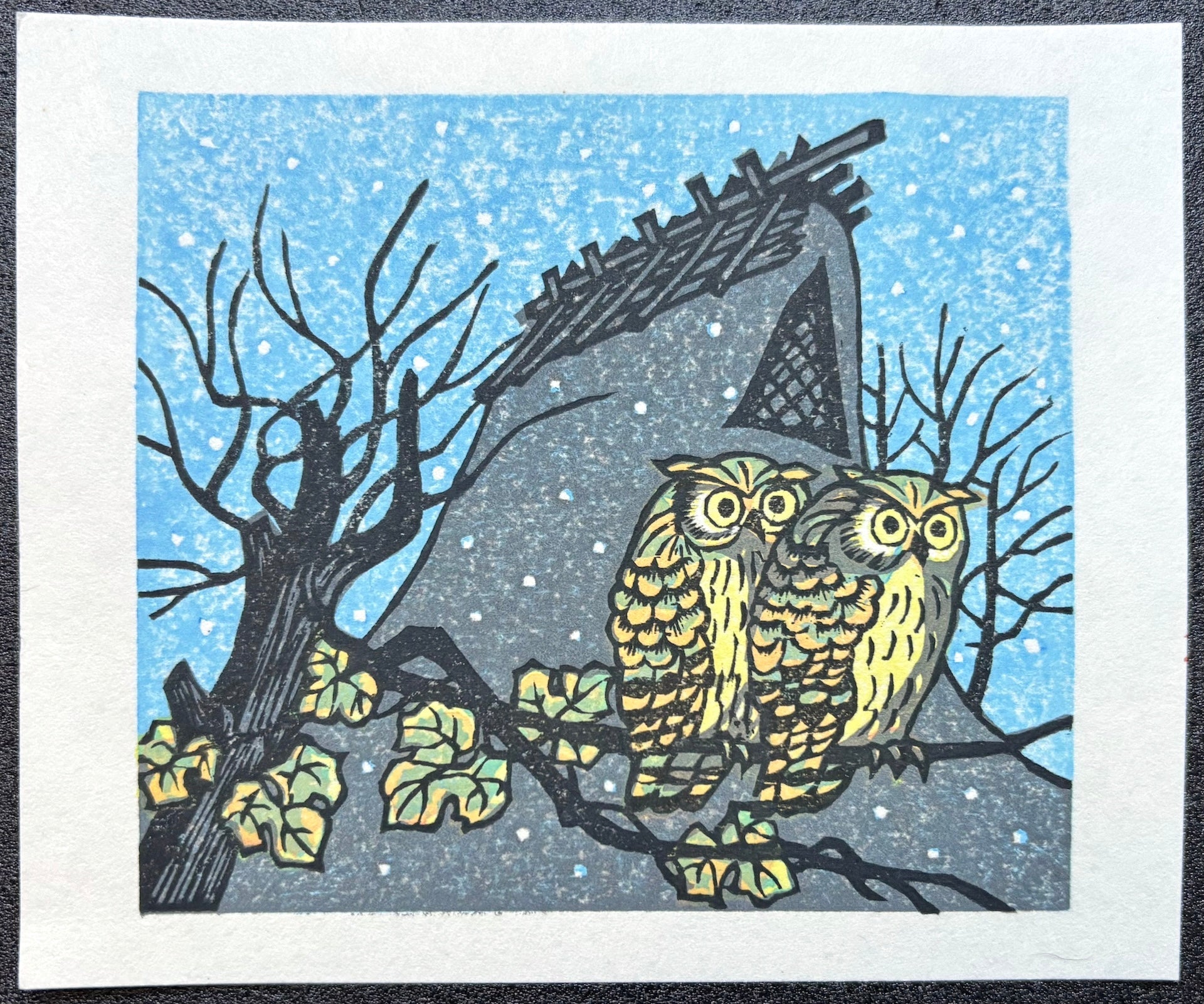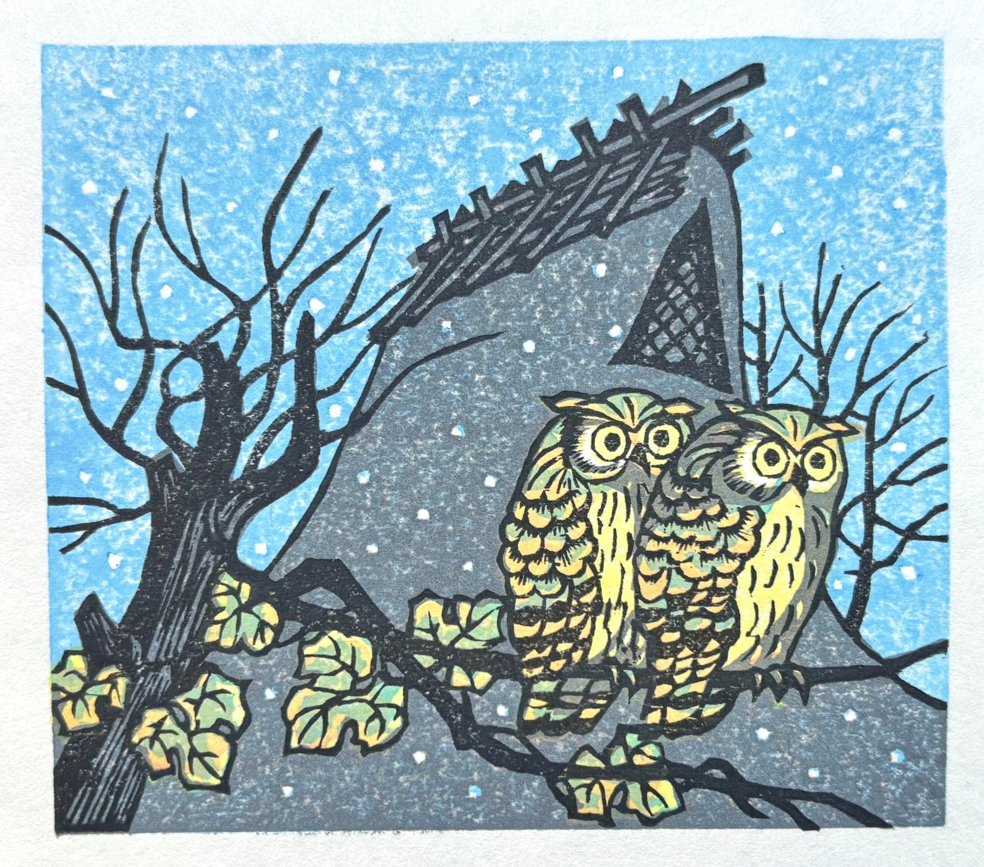 This print captures a tranquil winter moment in a mountain village. Two owls perch on a branch amid the falling snow, adding to the quiet atmosphere with their adorable charm.