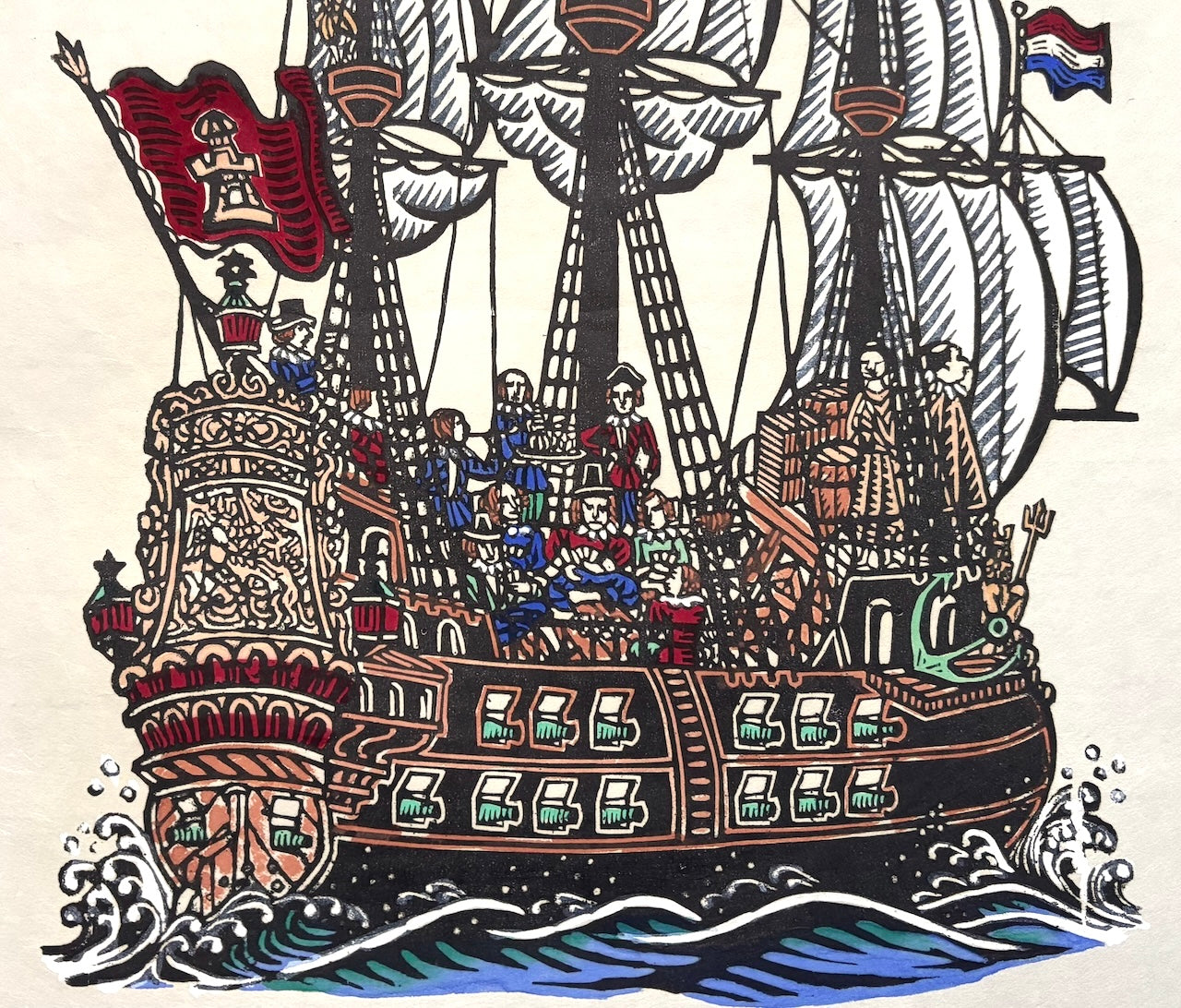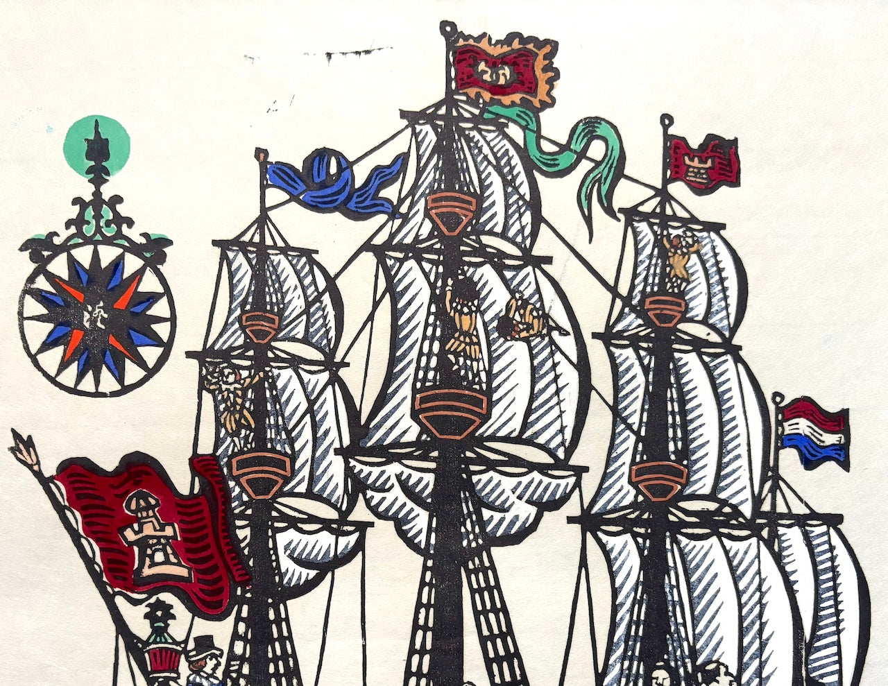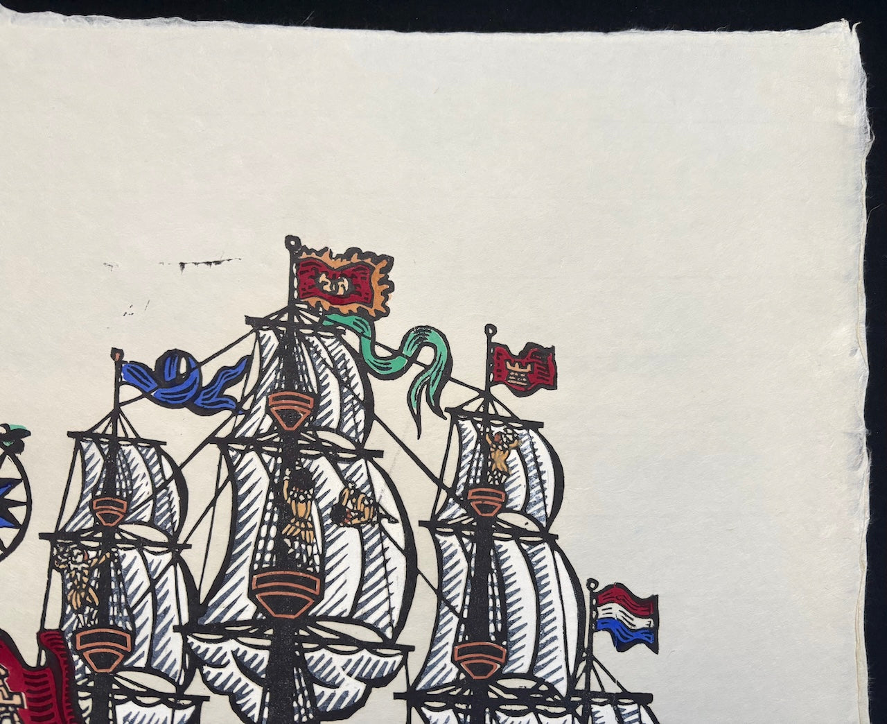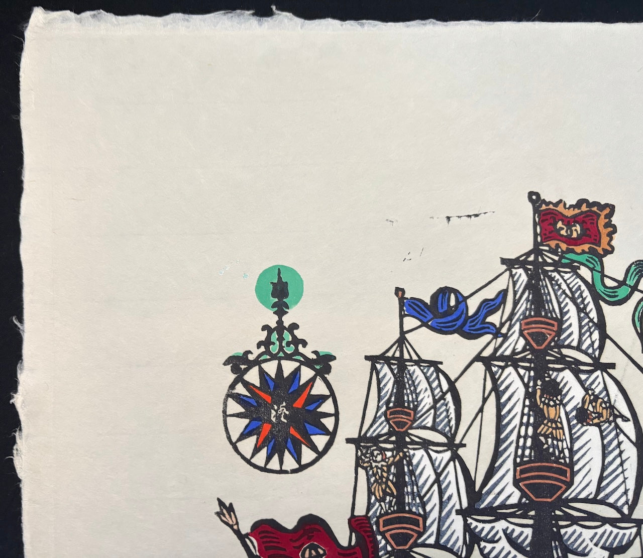 The remarkable woodblock print “Nanban-sen” (Nanban Ship) is by Sumio Kawakami (1895–1972). This large-format print is a later impression from the original blocks carved in 1939, printed with a single black block and then hand-colored. The image is exotic and visually striking, with rich, well-balanced colors.