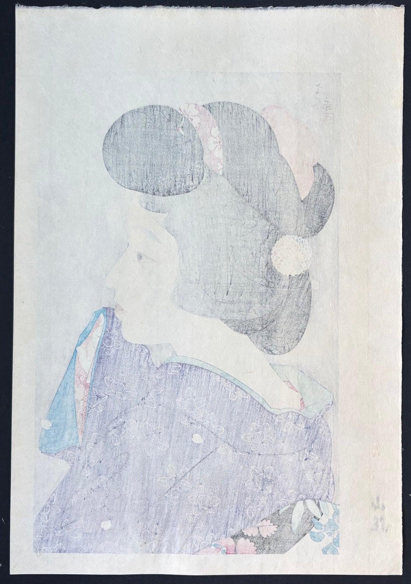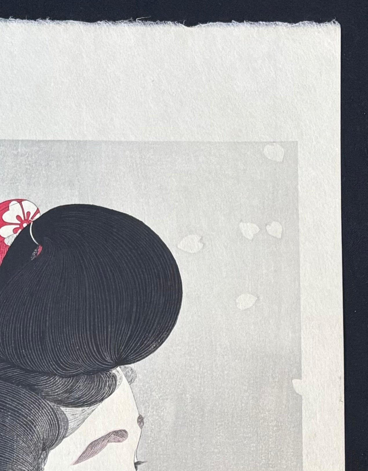 The amazing woodblock print Oboro Haru (Hazy Spring) is by Kotondo Torii (1900–1976). Oboro means “hazy,” and Haru means “spring.” This work gracefully captures a woman’s expression as she is captivated by cherry blossoms fluttering through the air on a soft, misty spring day. Featuring exquisite bokashi shading and exceptionally fine carving—especially visible in the individual strands of hair and eyelashes—this piece is both elegant and meticulously rendered.