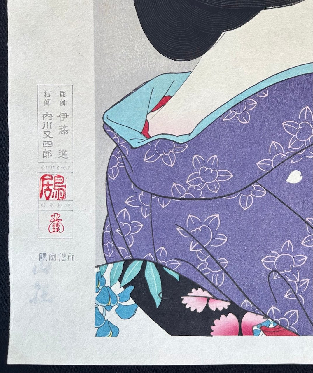 This later edition, published by Ishu Kanko Kai, is limited to 100 prints and printed on fine Japanese Washi paper with the “Sanso” watermark. The carver is Susumu Ito, and the printer is Matashiro Uchikawa. The print bears Torii’s red seal of approval and the publisher’s red moneybag seal, with the limited edition seal beneath the box.