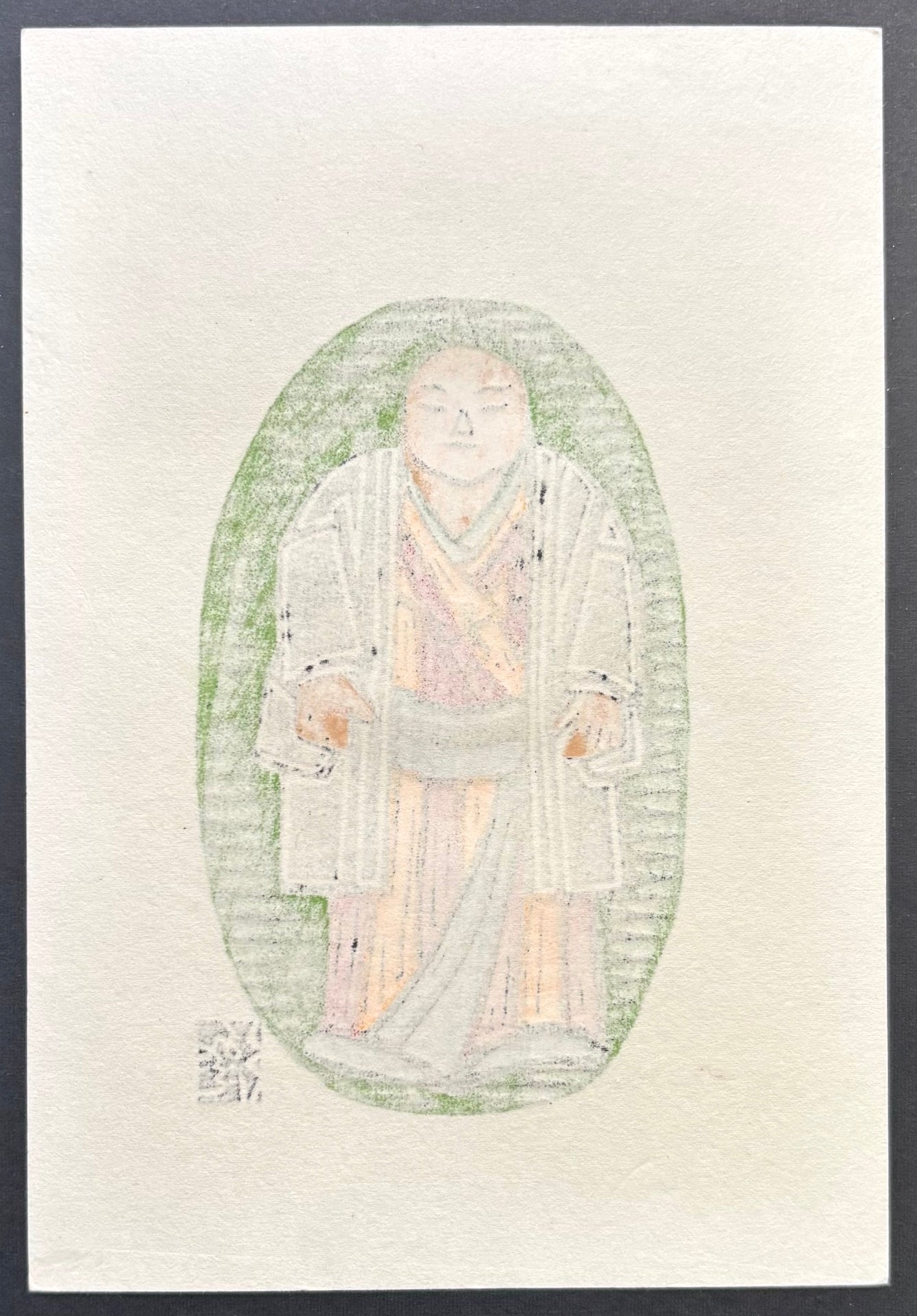 The small-format woodblock print “Osumo-san" (Sumo Wrestler) by Sumio Kawakami is a truly charming piece. In this delightful print, a sumo wrestler in a kimono, beautifully framed within the shape of a koban—the iconic gold coin from the Edo period. The scene feels cheerful and full of character. The artist’s block is signed “Sumi” on the lower right.