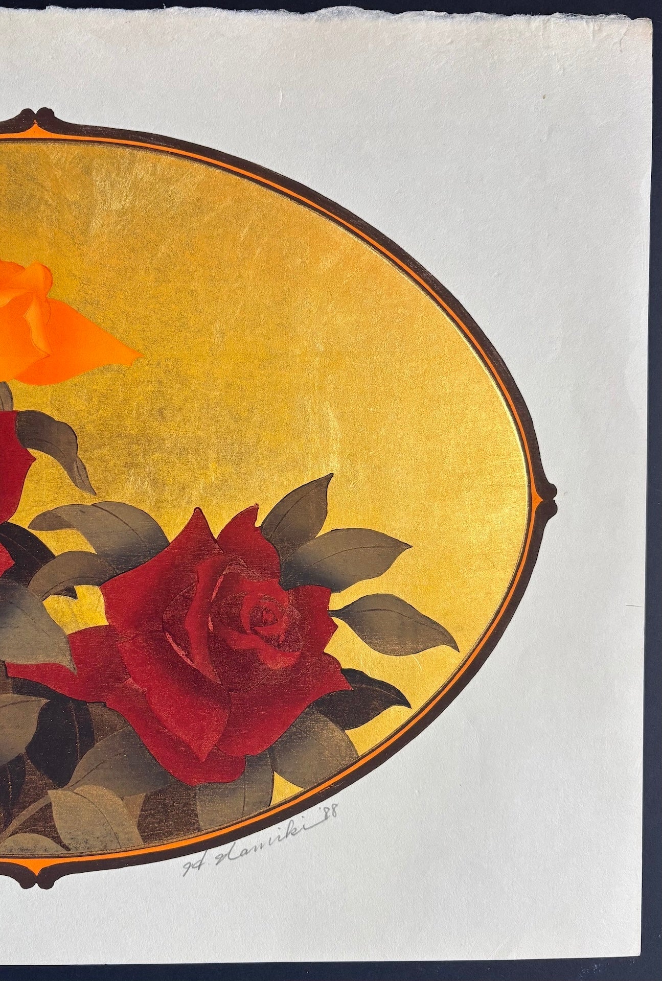 The elegant flower print "Rose-1" by Hajime Namiki features three roses beautifully depicted through an oval window. Their vivid colors glow against a shimmering gold background, creating a striking visual harmony. Printed in 1988, this early work is a rare gem—seldom seen on the market today.