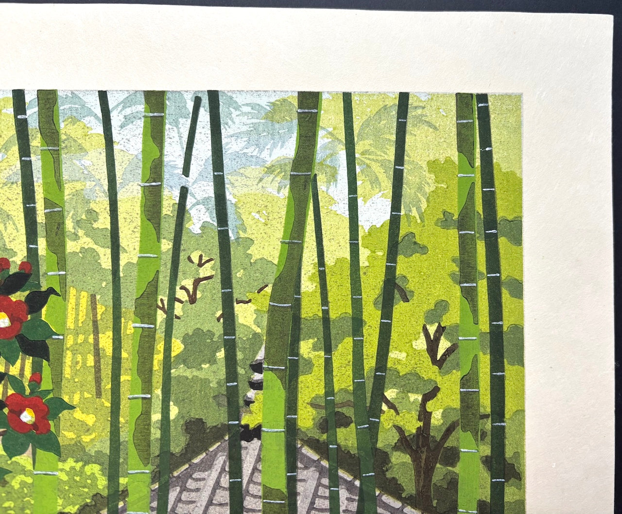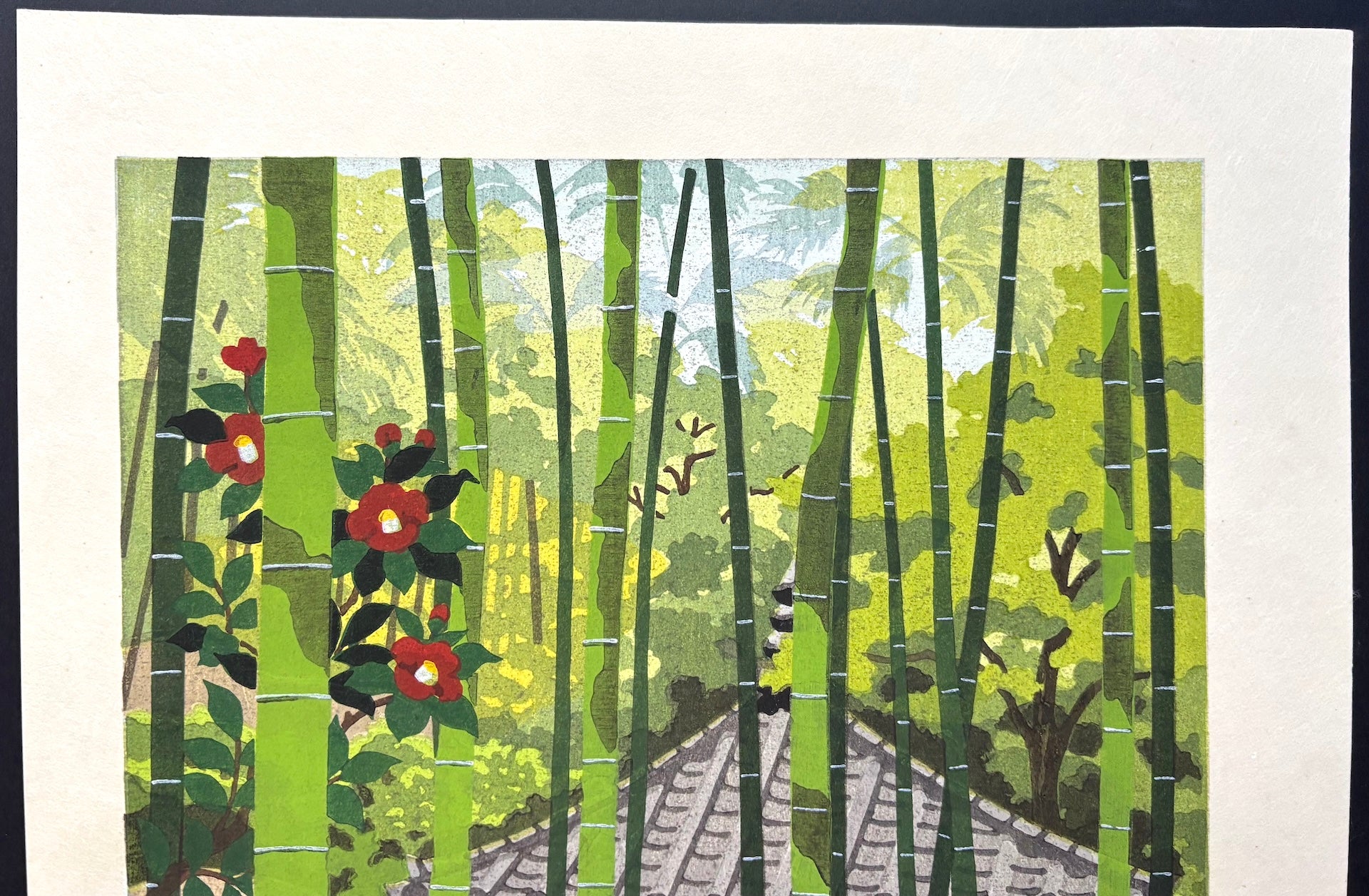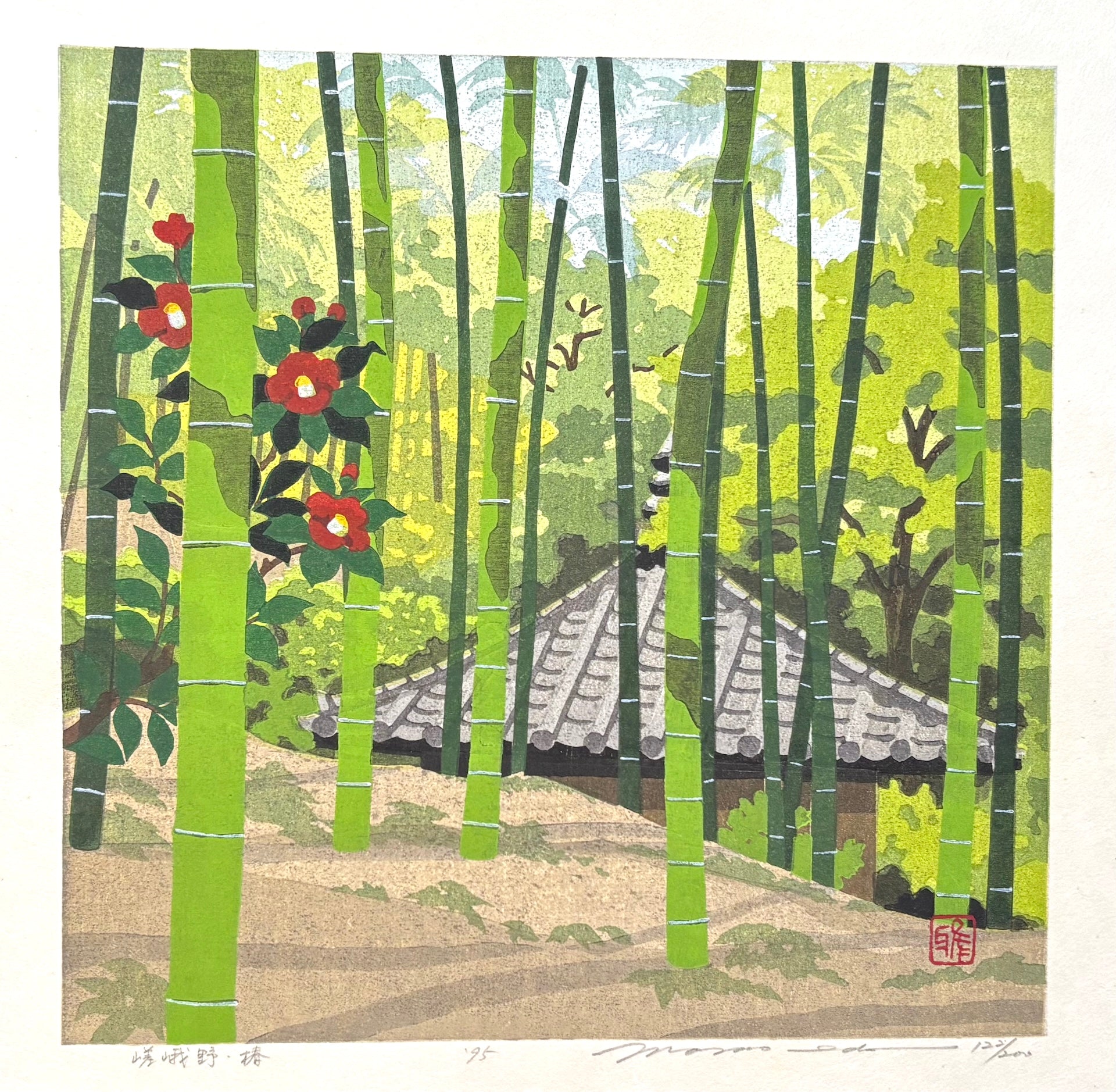 The serene woodblock print “Sagano Tsubaki” (Camellia at Sagano, Kyoto) by Masao Ido depicts camellia blossoms blooming in the cool bamboo forest of Sagano. Sunlight filters through the grove, casting beautiful shadows that enhance the composition.