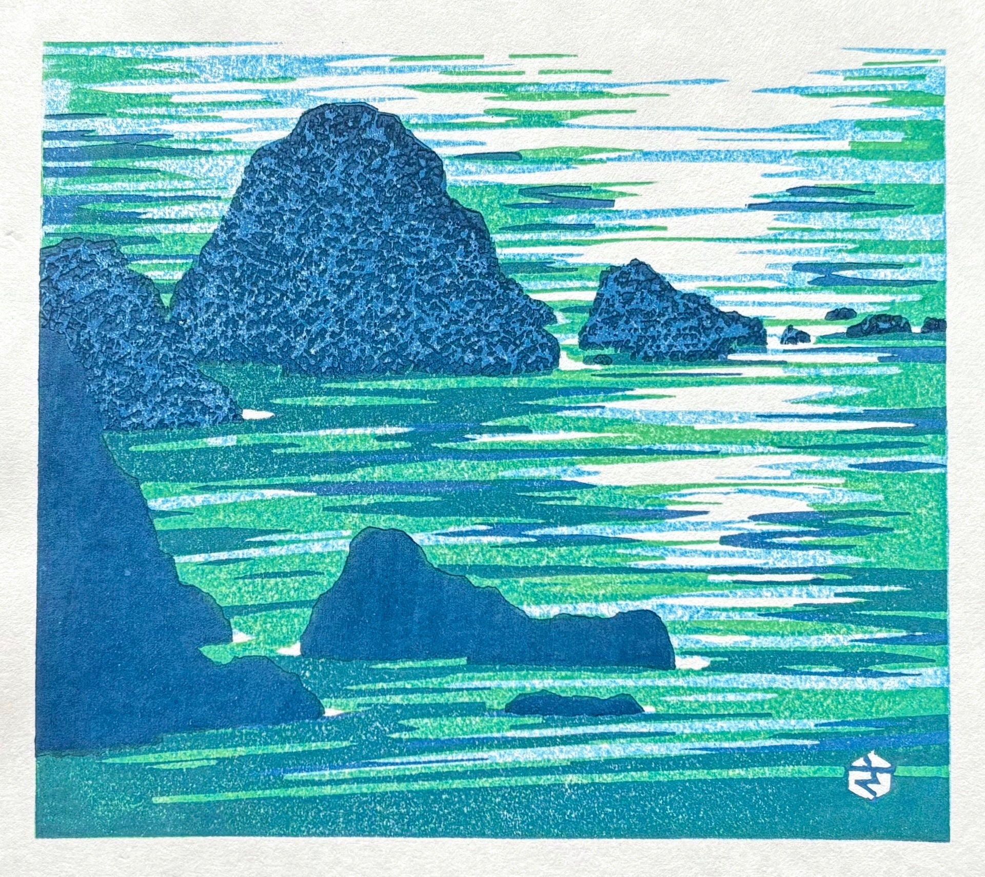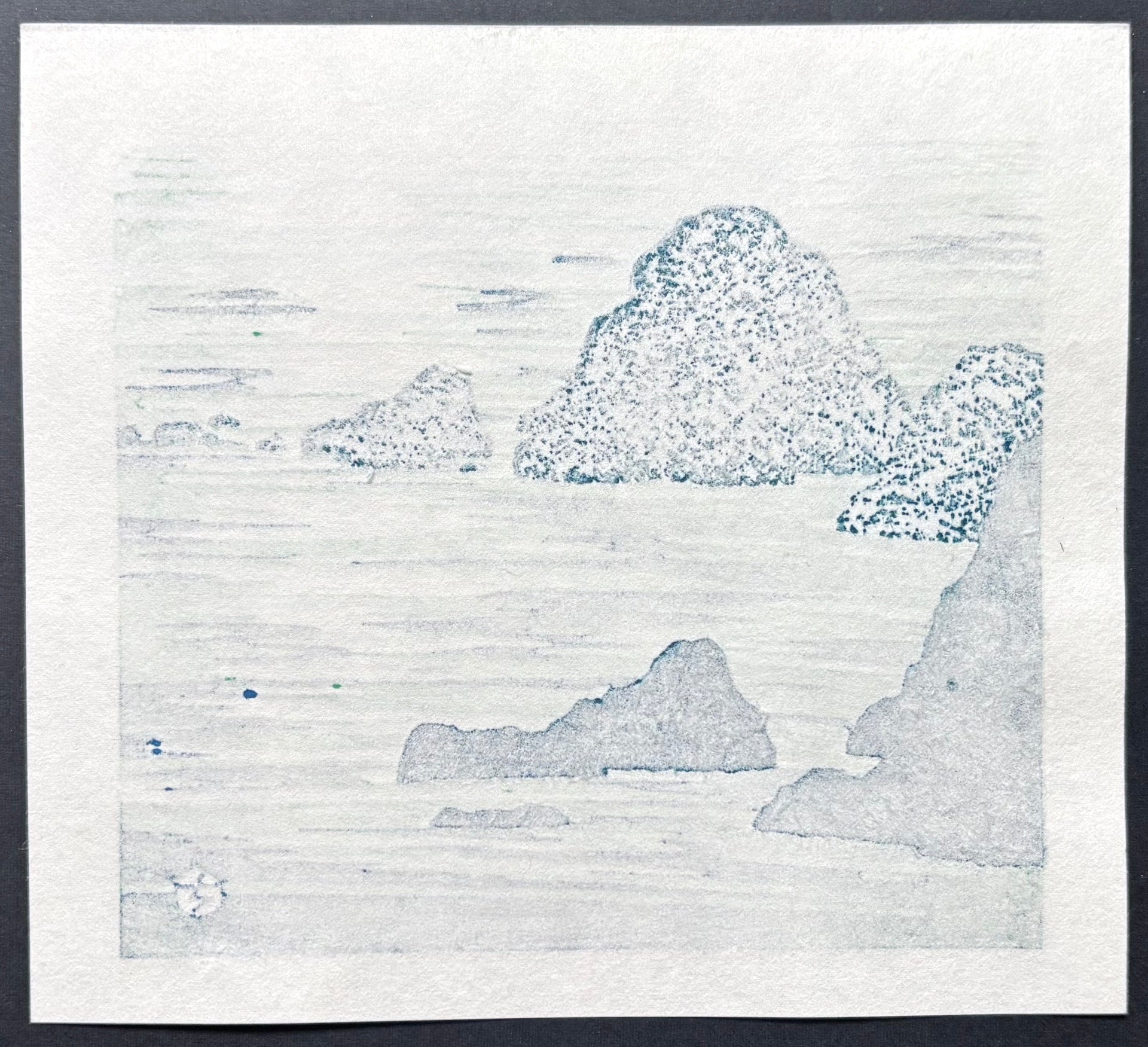 This small print beautifully depicts a rocky seascape in vibrant colors, with the sparkling water surface rendered with great delicacy.