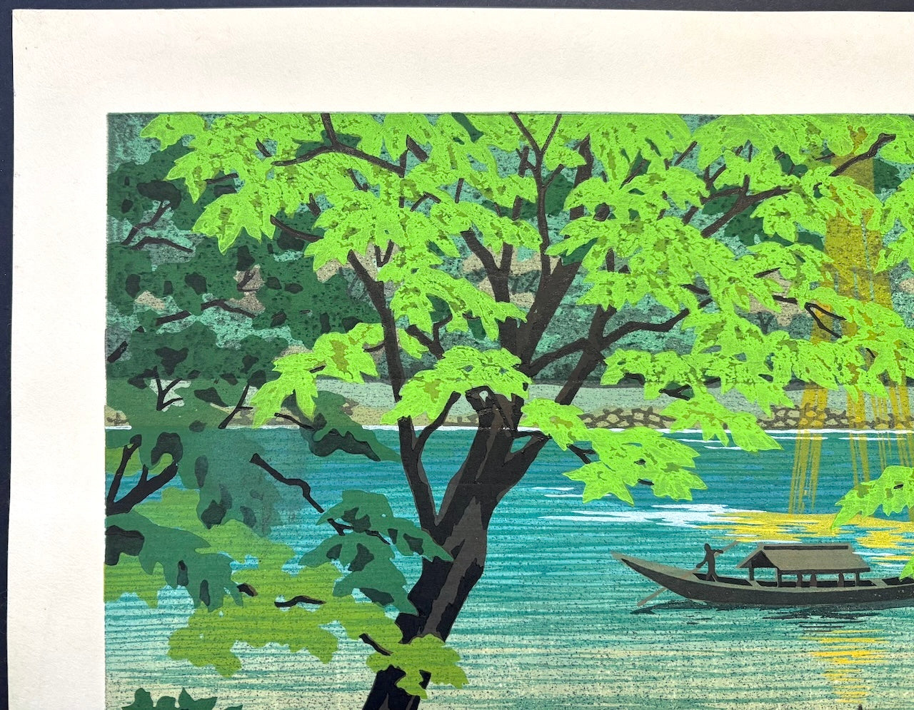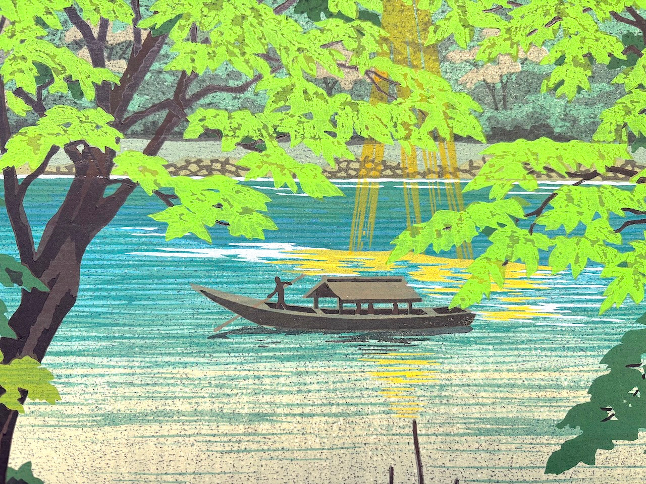 The serene woodblock print Seiryū (Clear Stream, Kyoto) by Masao Ido depicts a peaceful summer view of Arashiyama, Kyoto. The fresh greenery is beautifully expressed in gentle shades of green, and soft sunlight highlights a single drifting wooden boat, creating a calm and soothing atmosphere. The scene feels quiet, relaxing, and serene.