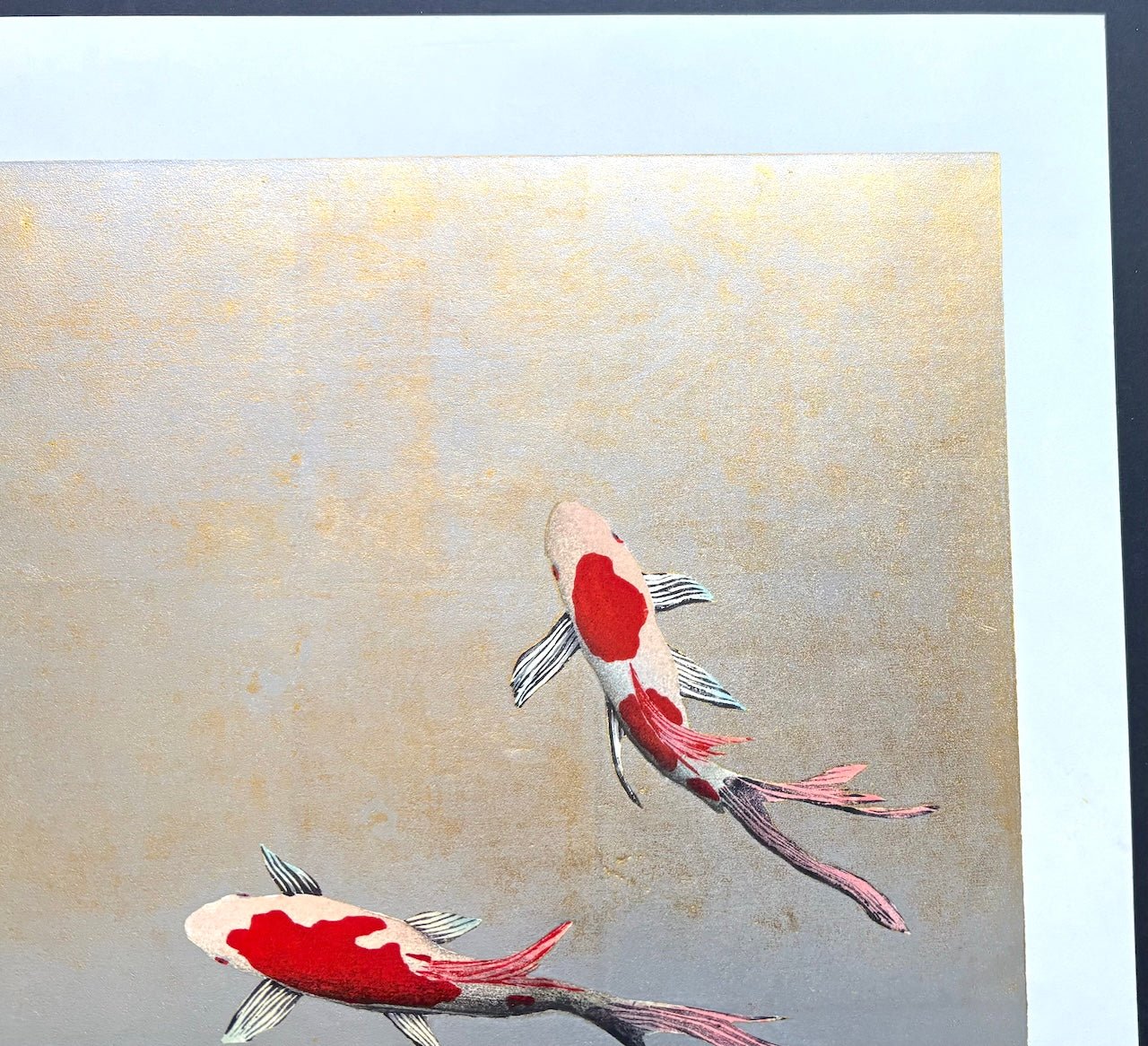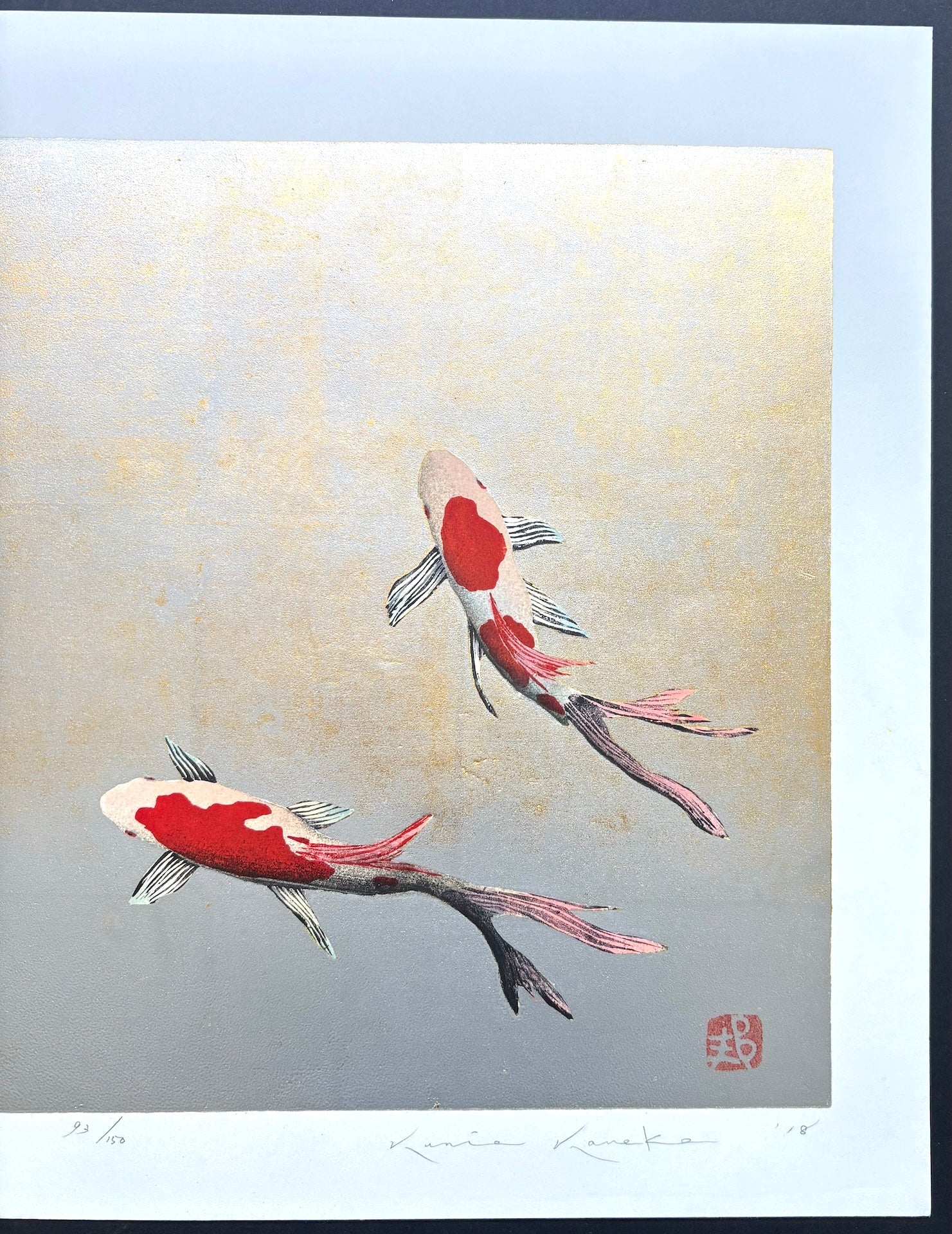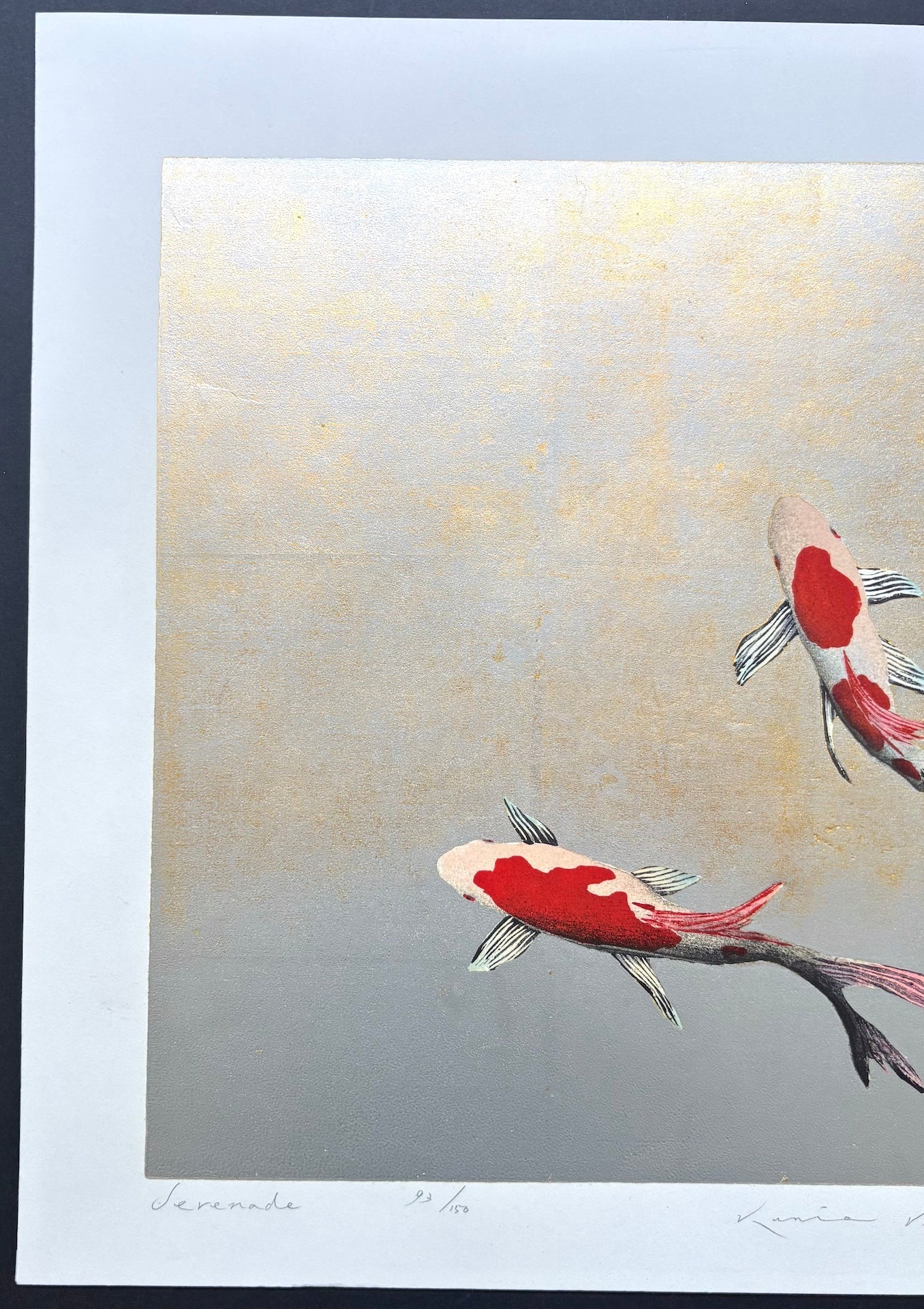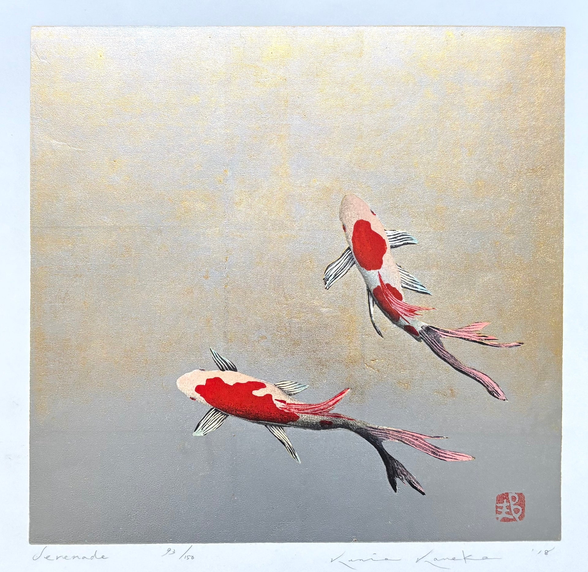 The beautiful woodblock print “Serenade” by Kunio Kaneko features a sophisticated and elegantly rendered koi. The use of empty space in the composition reflects the Japanese aesthetic of simplicity and subtlety, enhancing the tranquil mood of the work. It is a refreshing and lovely piece.