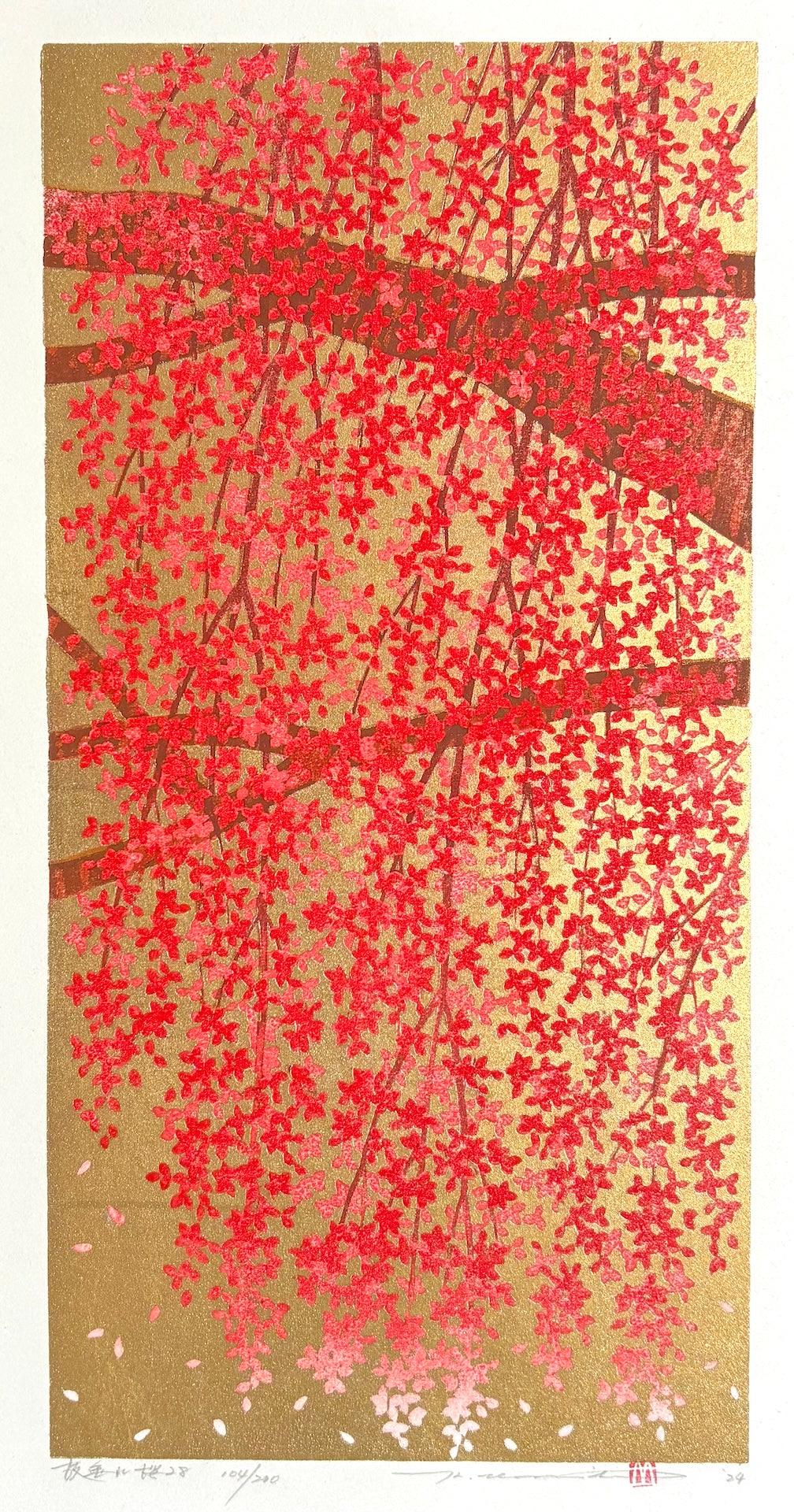 The lovely woodblock print “Shidare Zakura 28” (Weeping Cherry 28) is by Hajime Namiki. This exquisite piece captures the delicate and graceful weeping cherry tree in stunning detail. It is a limited edition of only 200 prints.