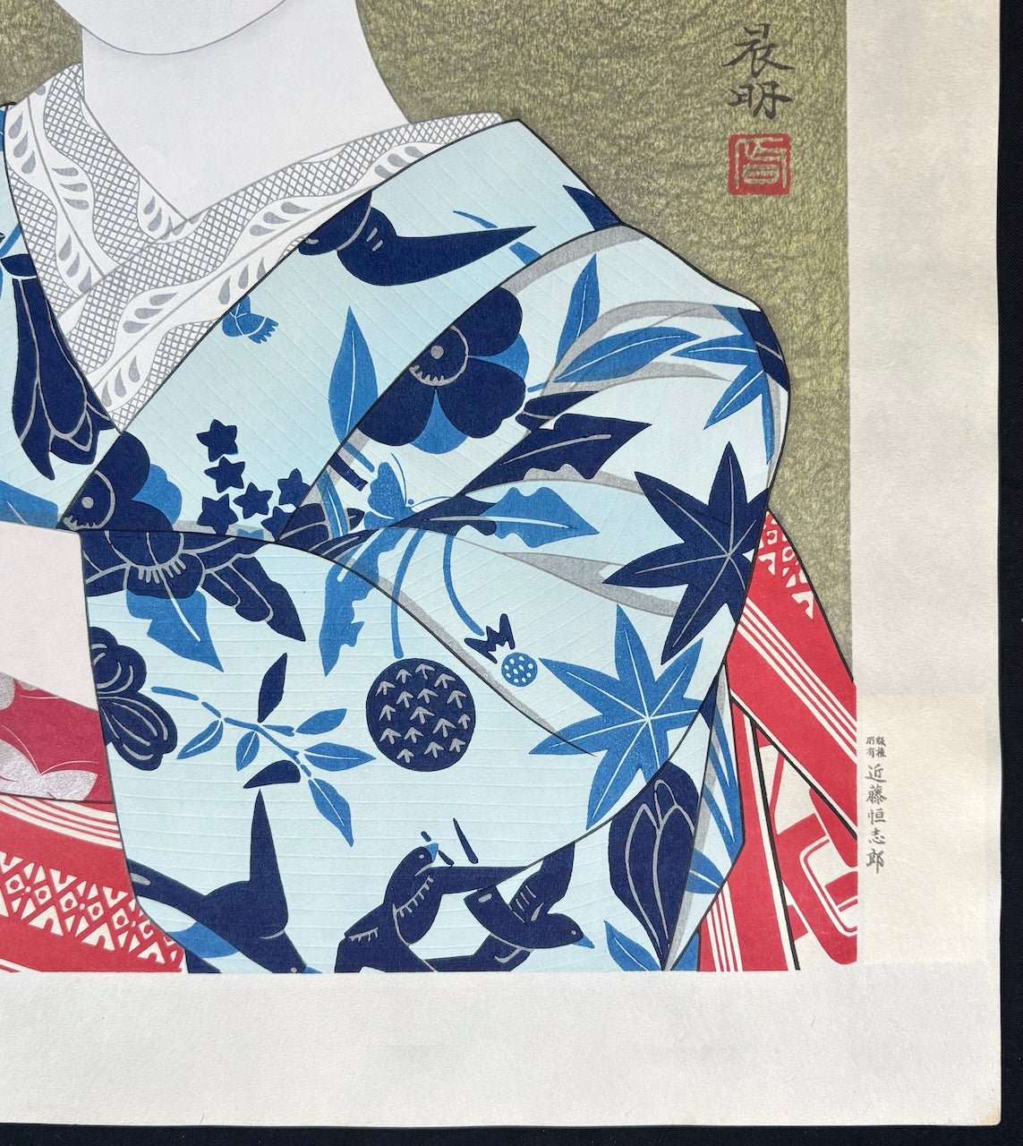 A lovely maiko is playing the Japanese 鼓 (tsuzumi — a traditional hand drum) used in classical Japanese music. This gorgeous bijin-ga woodblock print features spectacular colors. You can see the beautiful baren marks in the background. Her hair ornament, makeup, and nail polish are a soft pink, like cherry blossoms, adding a delicate and fresh atmosphere to this exquisite print.