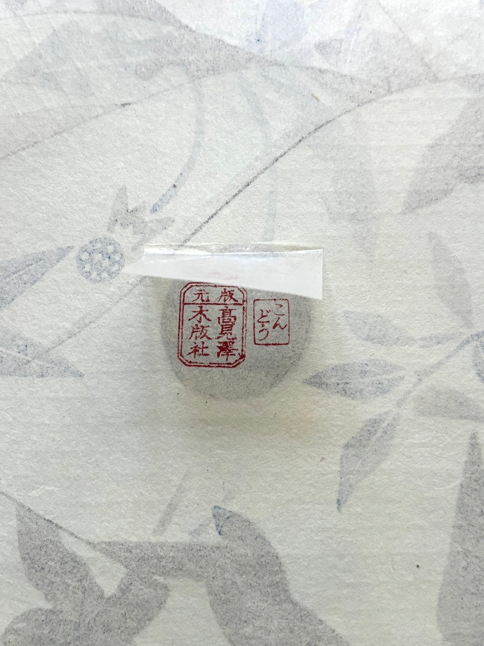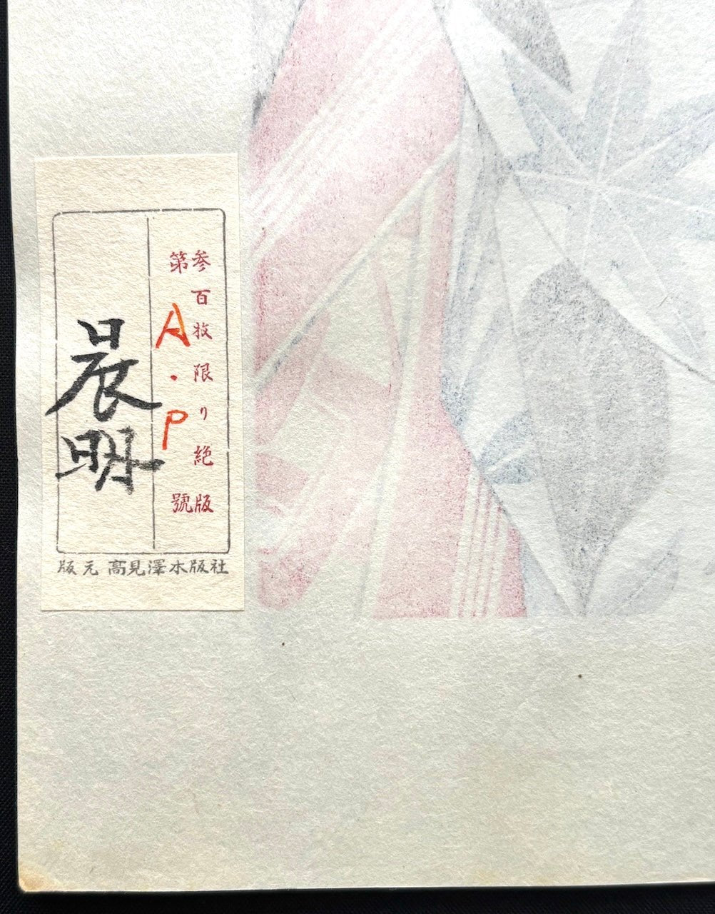 The edition number A.P. (from a limited edition of 300) is stamped on a label on the lower left edge of the verso, along with the artist’s hand-signed “Shinmei” and the publisher’s name. A red Takamizawa publisher seal and a Kondo seal also appear on the verso, along with a thin paper cover.