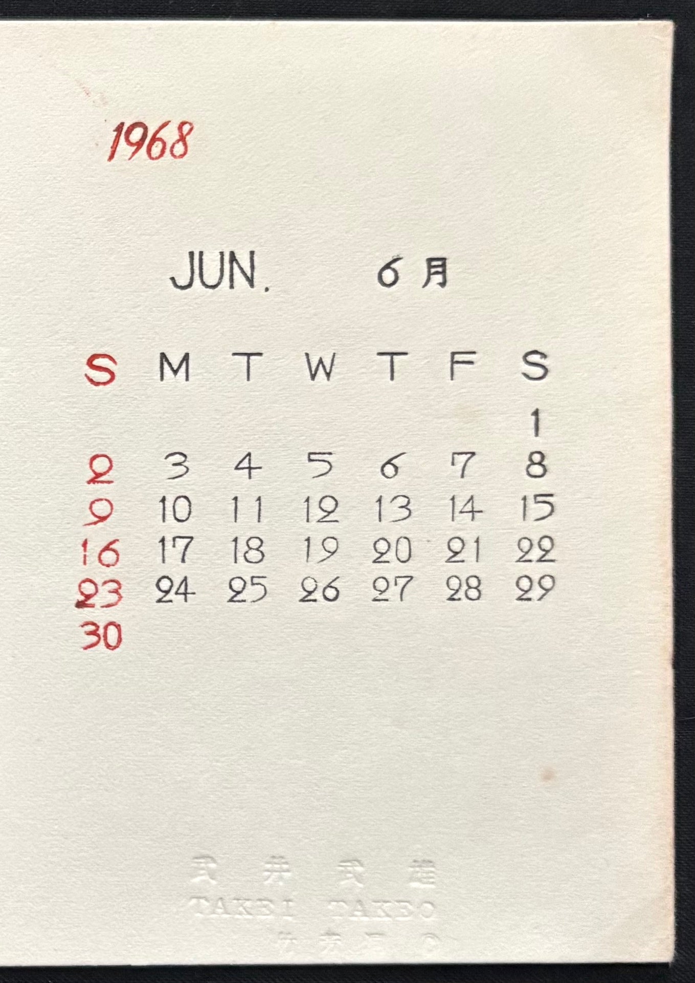 This beautiful small-format woodblock print is by Takeo Takei (1894–1983). The print features a Japanese fan with a bird design and subtle linear embossing. It was created for a 1968 calendar and published by Chikuho-do. This handmade woodblock print would be perfect décor for a small space and would also make a wonderful gift for someone born in June 1968.