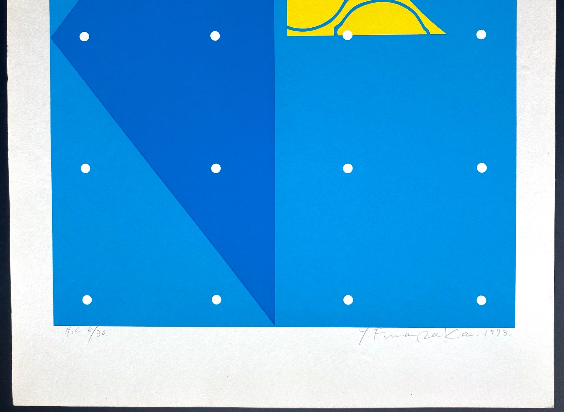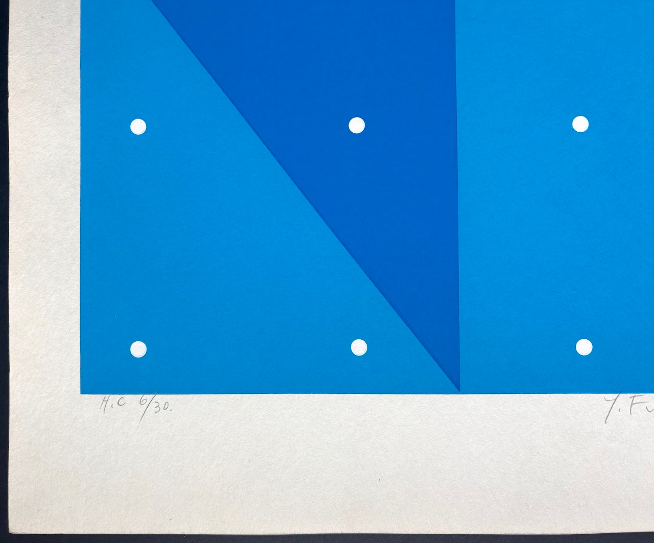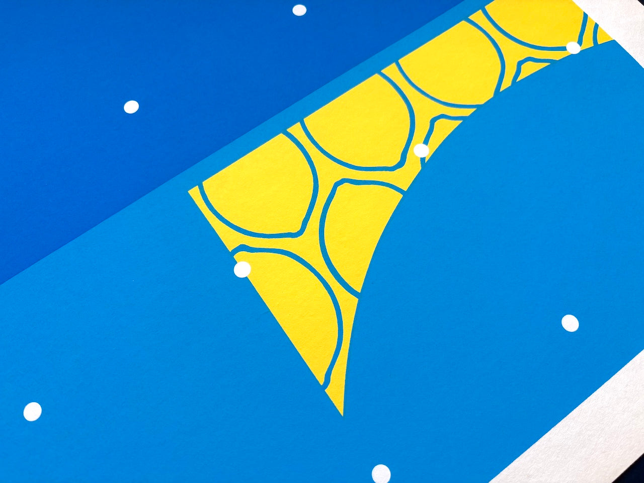 The striking woodblock print "Summer", from The Lemon and the Four Seasons of Japan series, is by Yoshisuke Funasaka. This series features his iconic lemon motif interpreted through Japan’s four seasons, with this work embodying the freshness of summer. The exceptionally large format is immediately eye-catching. Vibrant blue tones create a beautiful contrast with the lemons, resulting in a refreshingly crisp composition. Its simple elegance and vivid palette make it an excellent complement to modern décor.