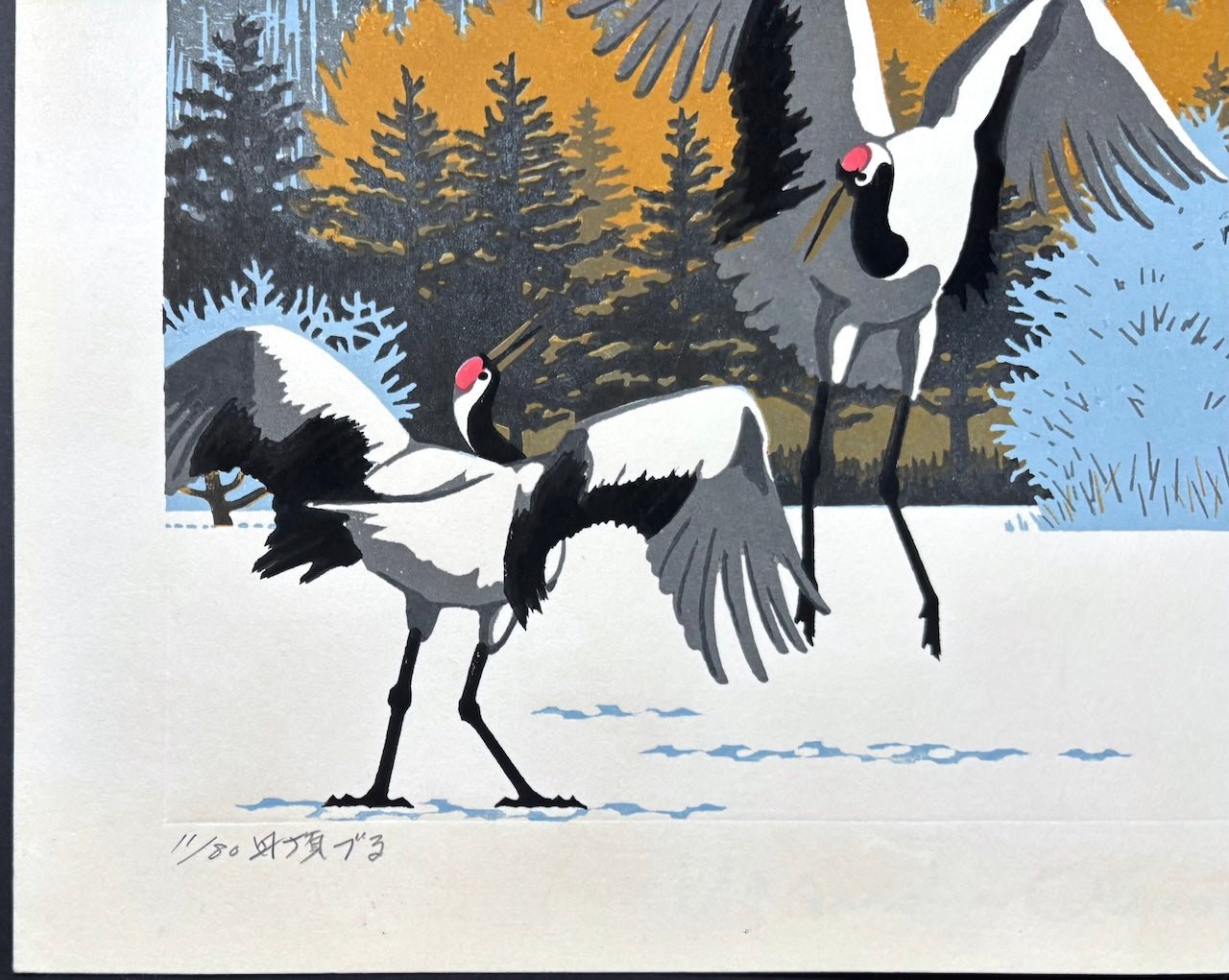 The superb woodblock print 'Tanchozuru' (Red-Crowned Cranes) is by Yasushi Ohmoto (1926–2014). This print depicts a flock of red-crowned cranes that live in Hokkaido. The red-crowned crane is the largest crane native to Japan and is found mainly in eastern Hokkaido. Because of its pure white plumage and elegant appearance, it has long been regarded as a sacred bird and a symbol of good fortune. The image is brimming with vitality, capturing the harmonious relationship between the cranes and the natural world.