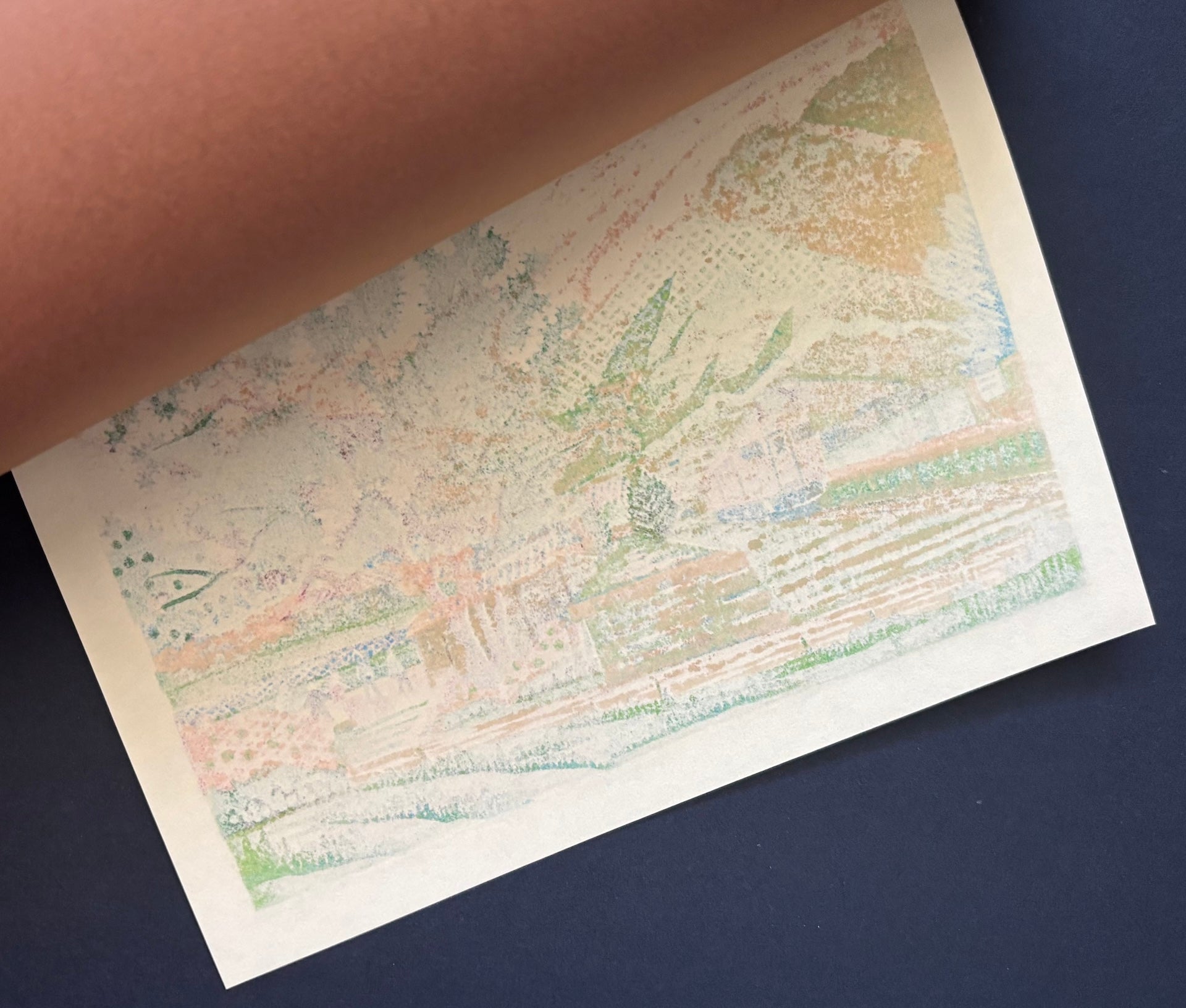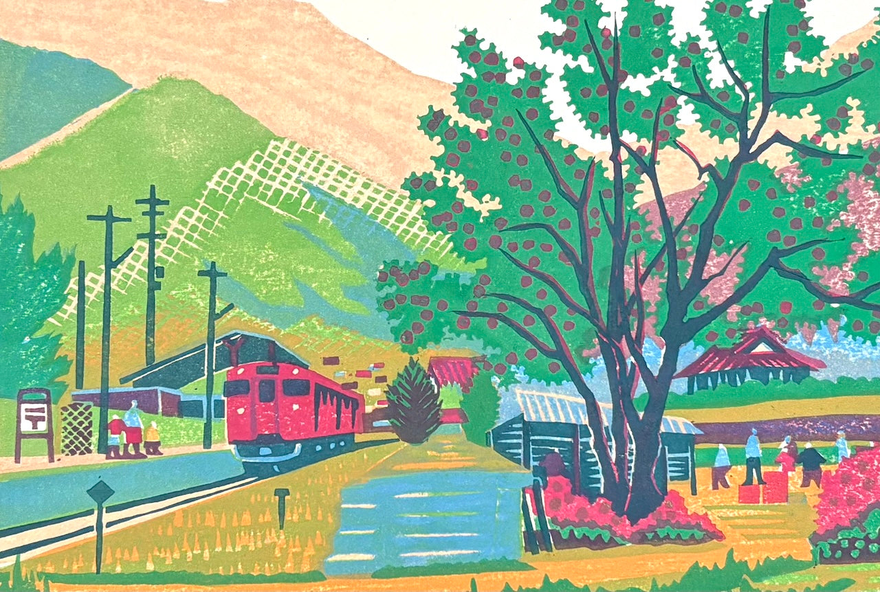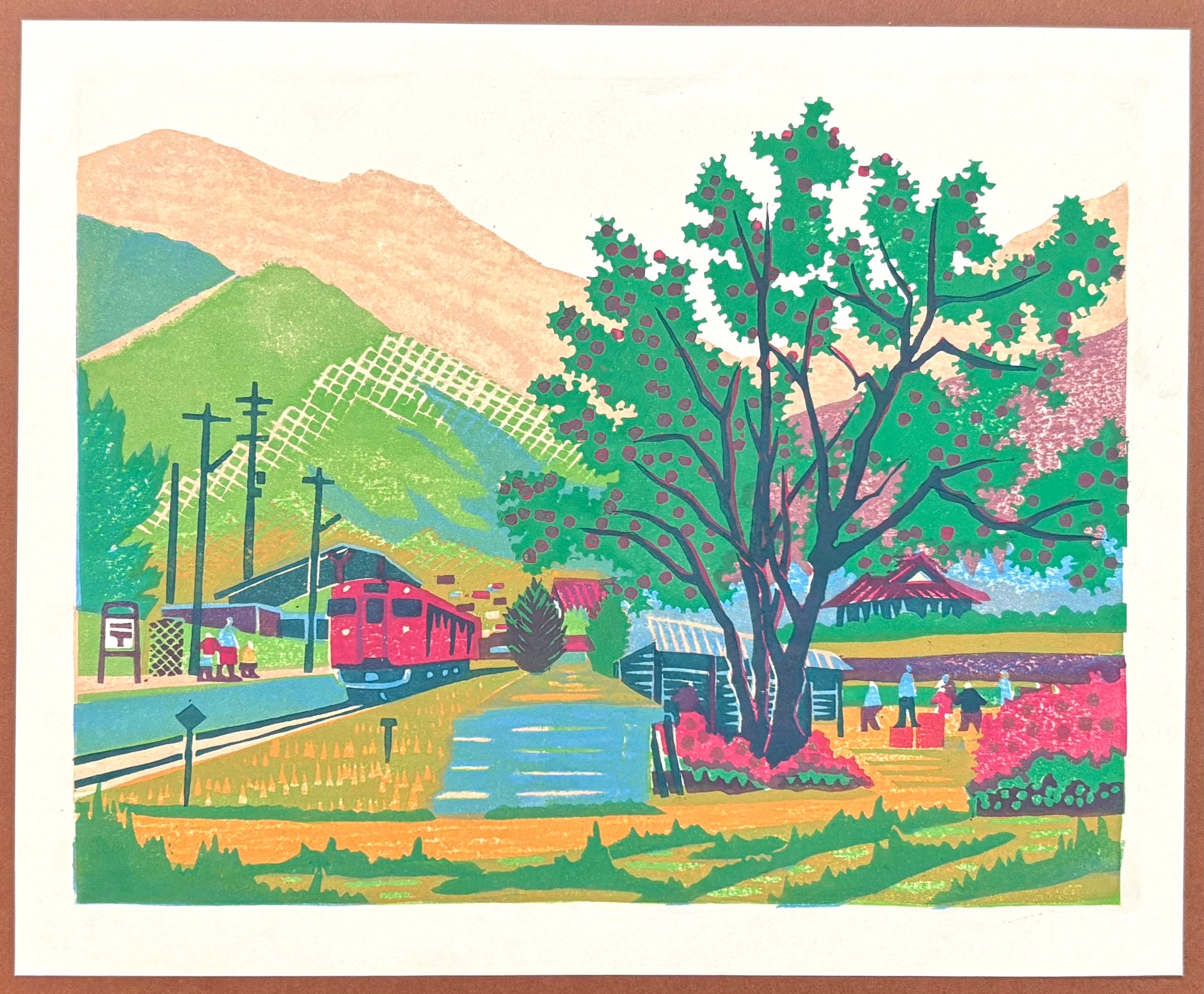The beautiful small woodblock print “Unmanned Local Train Station, Hiroshima” is by Osamu Ueda (b. 1947). This work depicts Nuno Station, an unmanned train station located in a little-known rural area. Unfortunately, the station was closed in 2003. The composition conveys a peaceful atmosphere, with the station standing quietly amid relatively undeveloped natural surroundings, where local residents gather in the lush landscape.