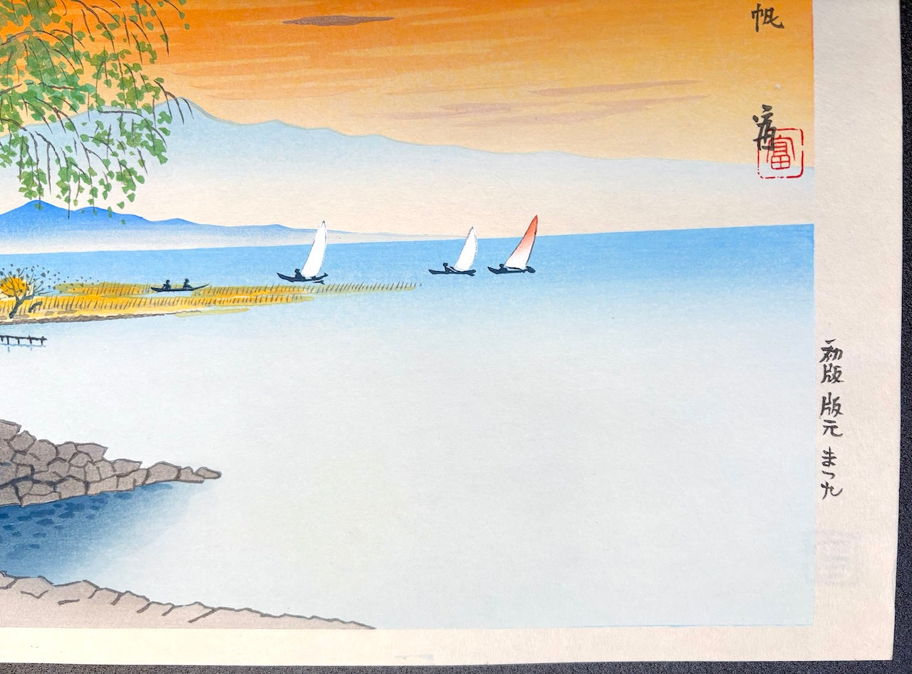 The beautiful woodblock print “Yabase Kihan” (Returning Sails at Yabase), from Tokuriki’s rare and highly regarded series “Ōmi Hakkei” (Eight Views of Ōmi Province), is by Tomikichiro Tokuriki (1902–2000). This is a hand-signed, limited-edition print.