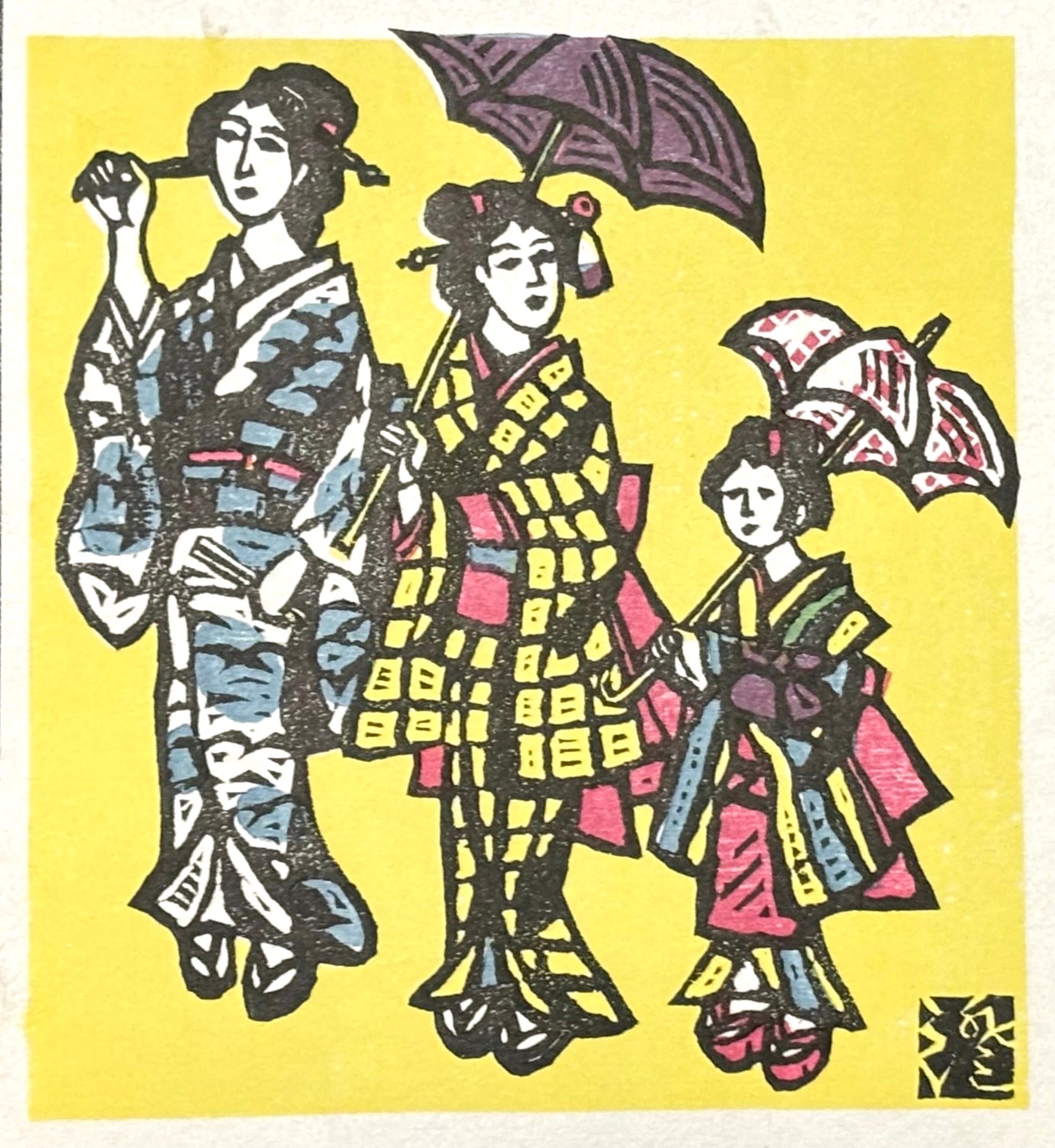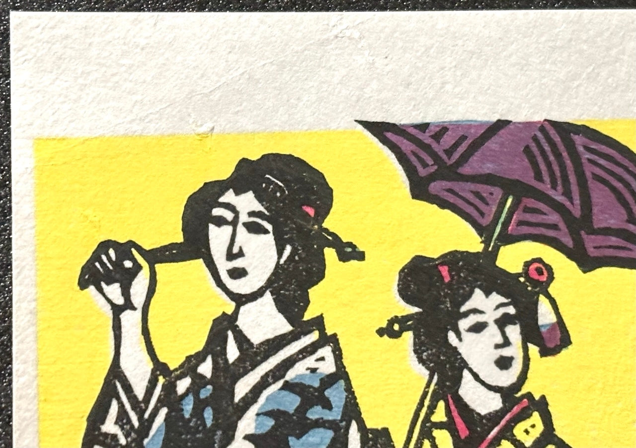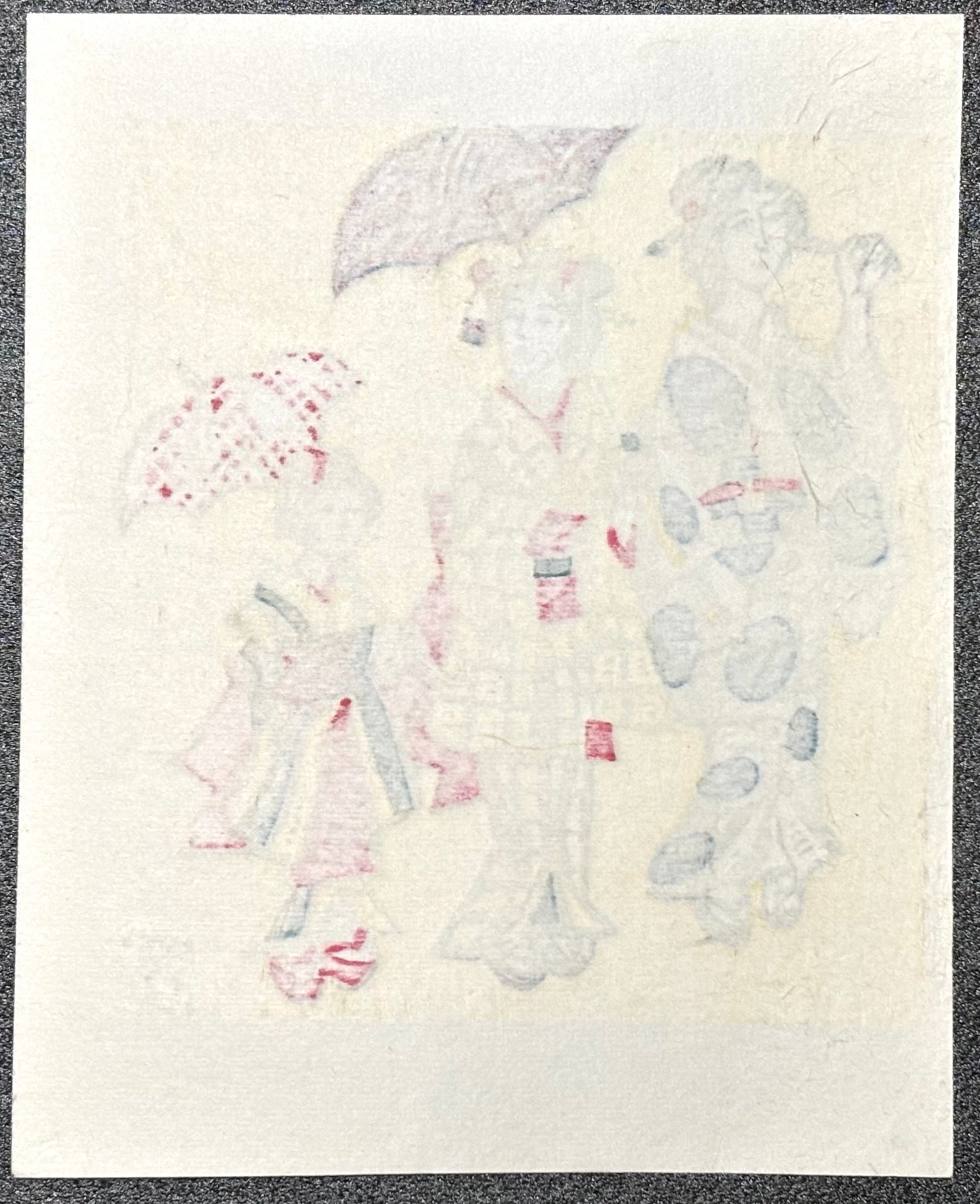 The small-format woodblock print “Zansho"(Women in Late Summer) by Sumio Kawakami features two women and a young girl enjoying a hot late summer day, carrying parasols for shade. It is a cheerful and charming piece. The artist’s block signature, “Sumi,” appears in the lower right corner of the image.